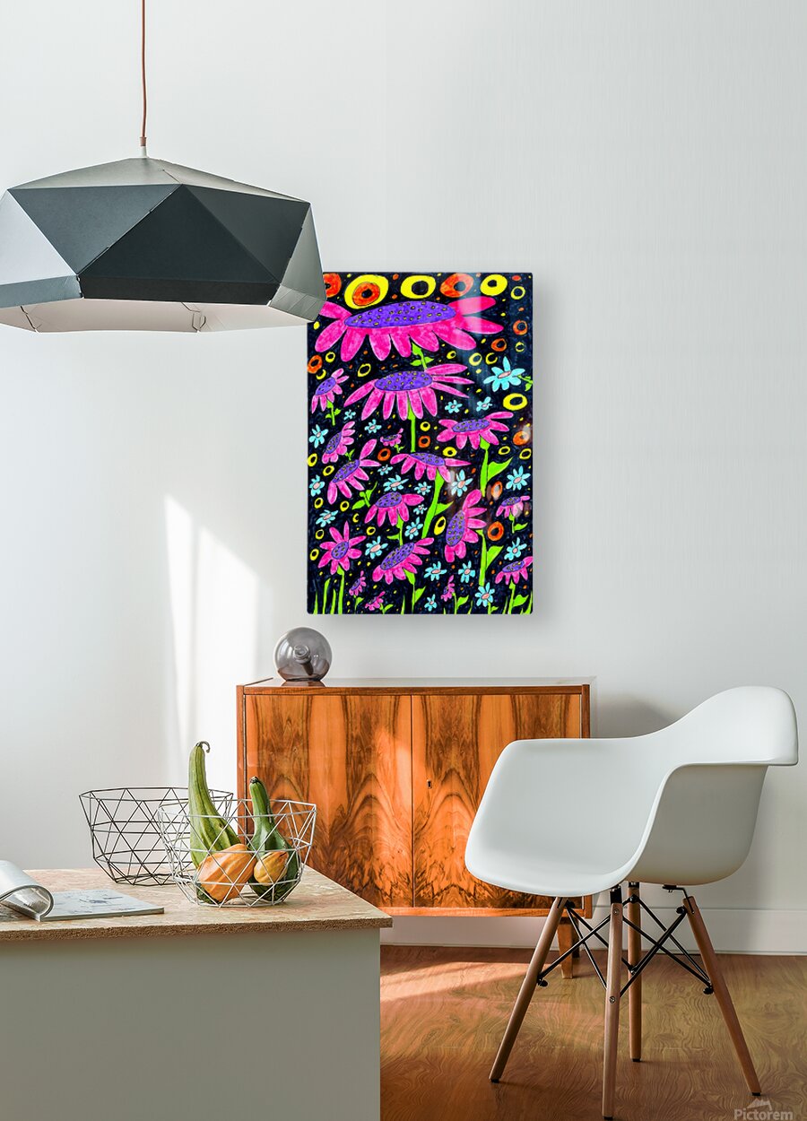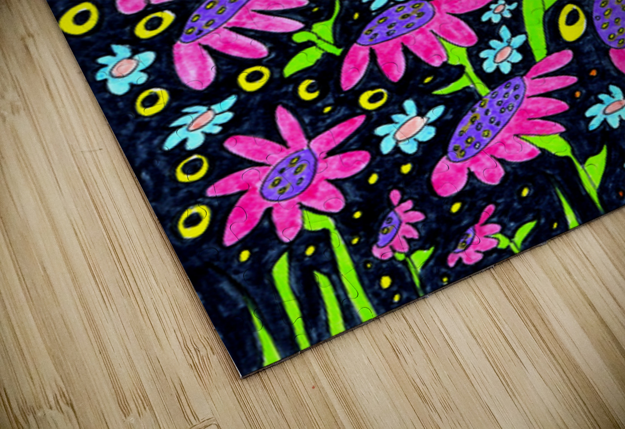 Originally a hand drawn nature inspired design created using colour ink pens and paper, laterally undergoing digital colour enhancement to allow a unique piece of abstract floral art to emerge. Features bright magenta flowers with spotted petals surrounded by small, light blue flowers, set against a dark, patterned background of colorful rings. The vibrant colors and playful arrangement create a lively and whimsical scene.