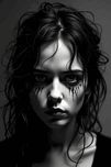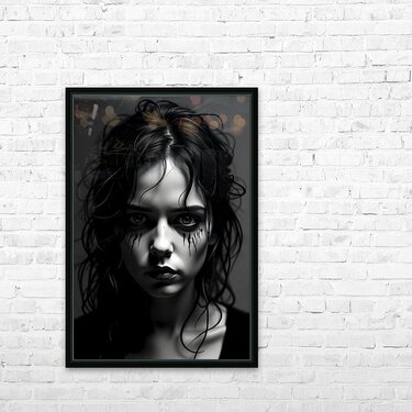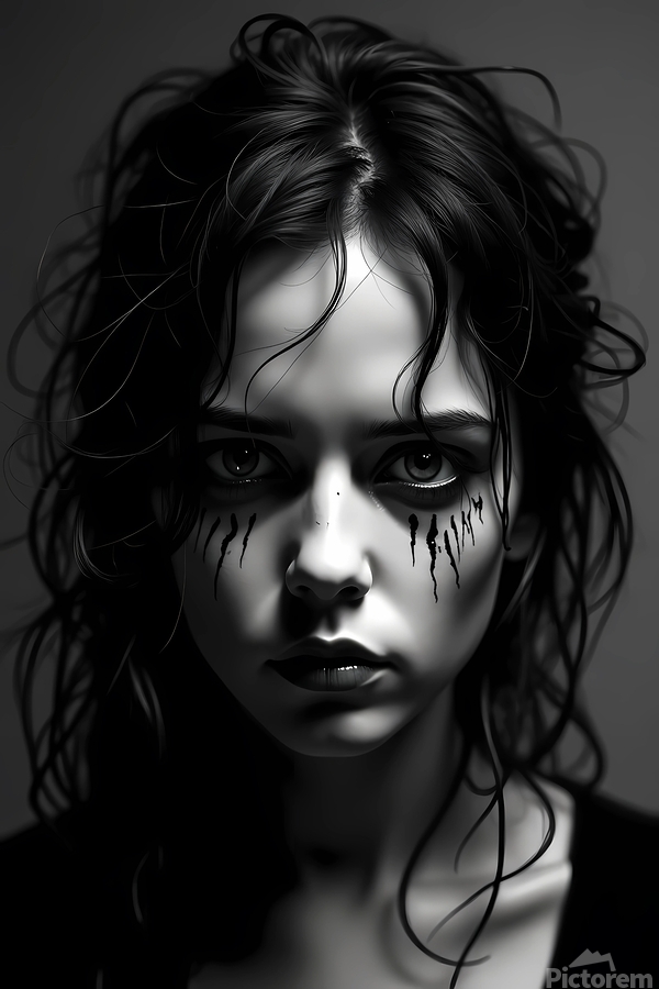 Experience the depth of silent emotion in this mesmerizing gothic portrait of a young woman with tear-streaked eyes. The stark black and white composi...[+]