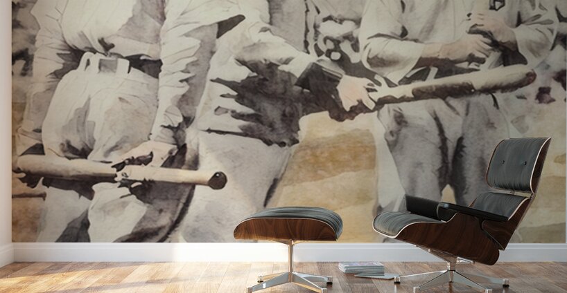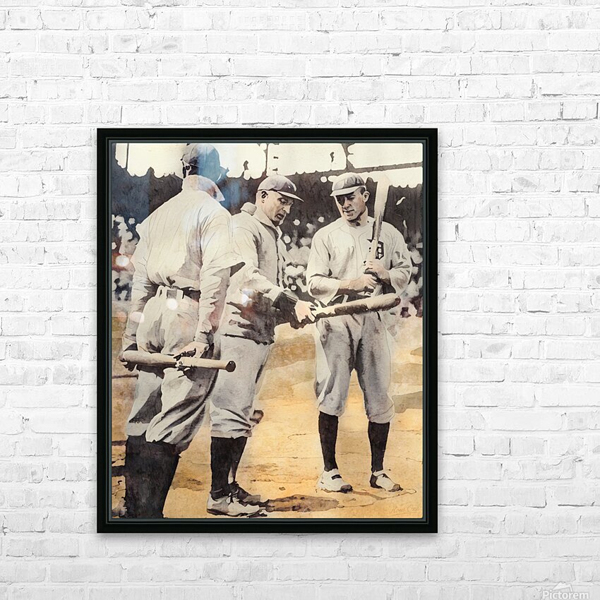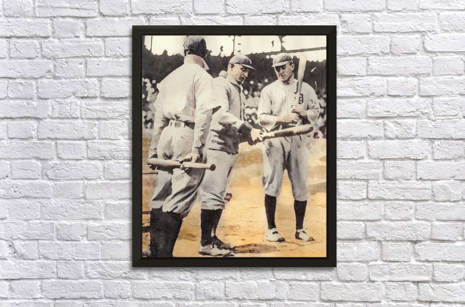 Honus Wagner and Ty Cobb compare bats in this Row One Brand mixed media painting showing these two baseball legends in the 1909 World Series. Derivati...[+]