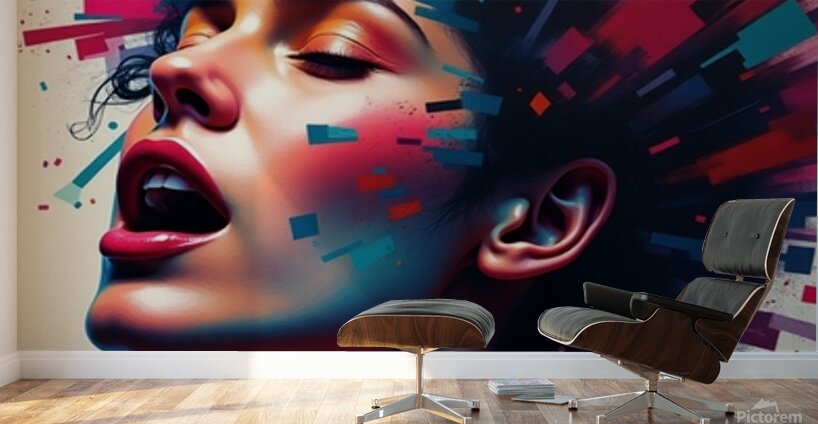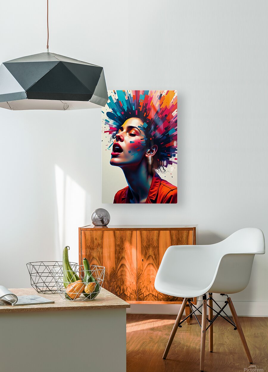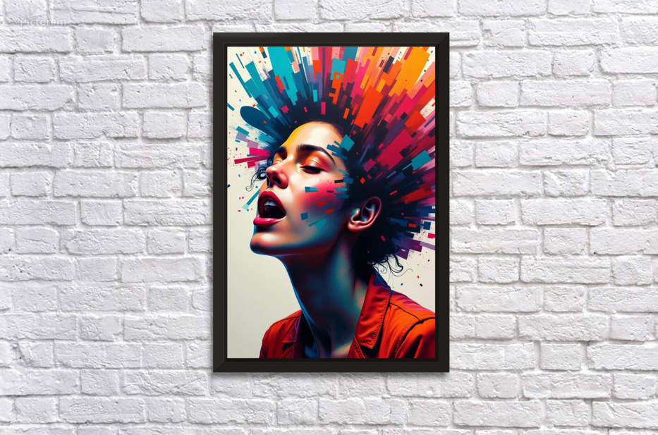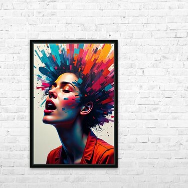 Neon Pulse is a visually electrifying portrait that fuses surrealism, pop art, and cyberpunk energy. Featuring a woman caught in an ecstatic moment of expression, this digital artwork explodes with vibrant geometric bursts of red, blue, orange, and pink—evoking the raw emotion of creativity, freedom, and empowered individuality. The contrast of soft human features against sharp digital abstraction creates a stunning visual tension, making this the perfect centerpiece for contemporary interiors, creative studios, and collectors of futuristic or avant-garde art. It's more than a portrait—it’s a digital mind-blast of passion and color.