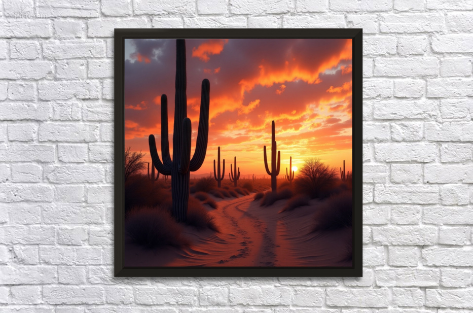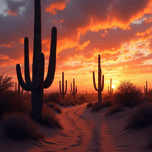 “Cactus Sunset Trail” transports you to the heart of the desert, where towering saguaro cacti line a sandy path beneath a dramatic, fiery sunset. ...[+]