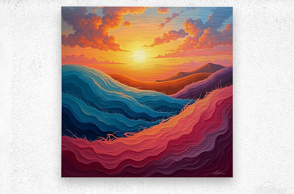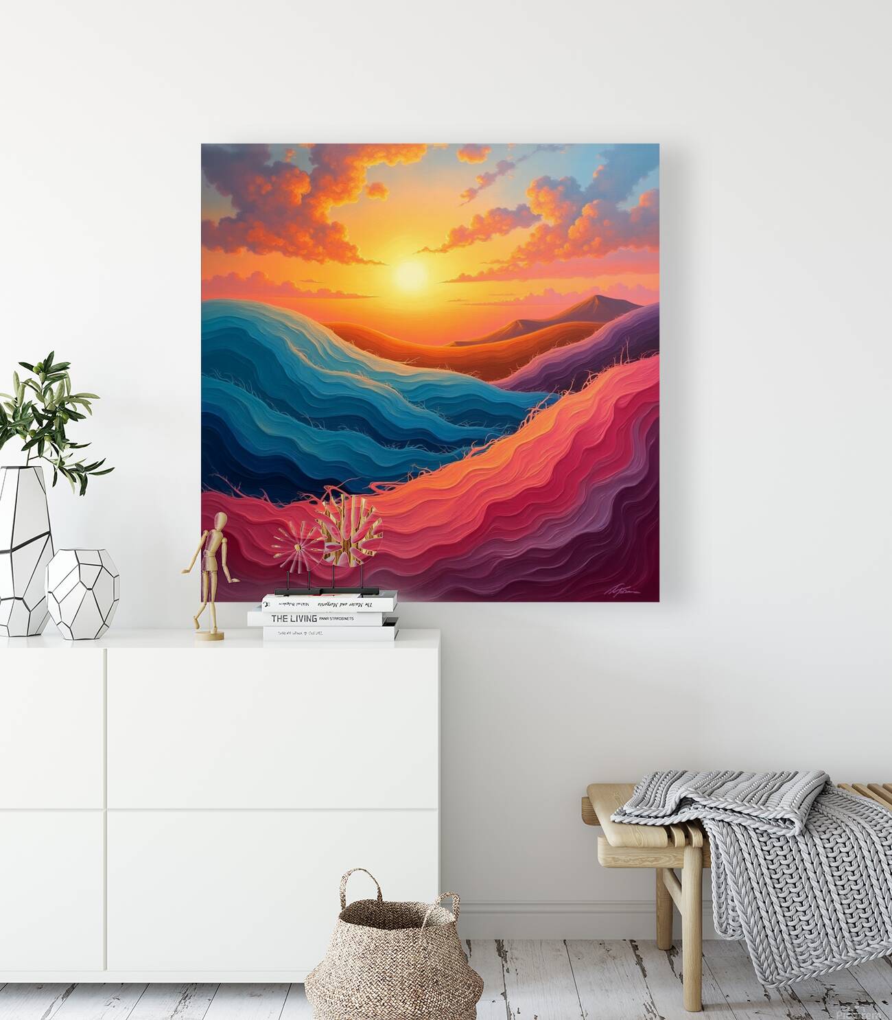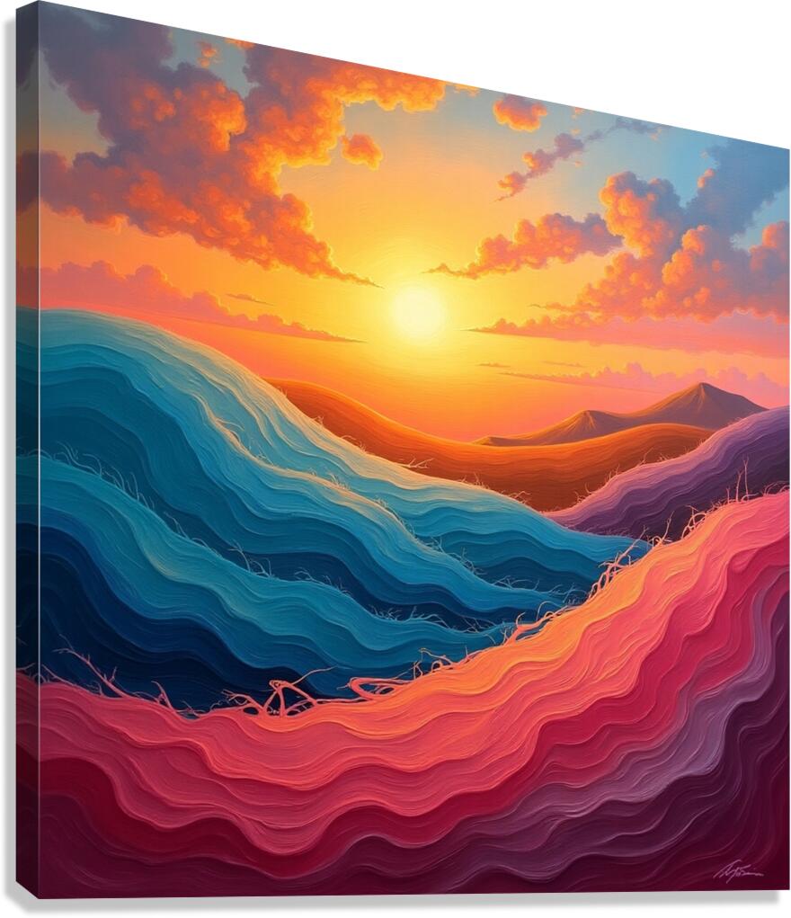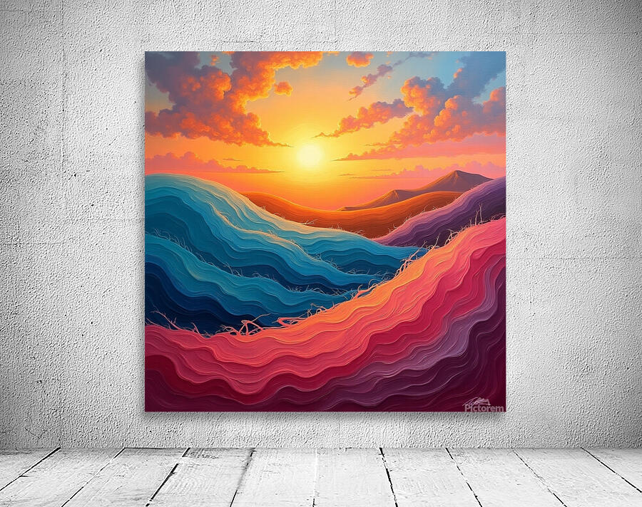 Step into a mesmerizing dream world with this surreal landscape art, where waves of color blend seamlessly into a glowing sunset sky. The vivid swirls of blue, pink, and violet flow like painted hills, creating a sense of motion and fantasy. This abstract interpretation of nature evokes emotion and wonder, making it a bold statement piece for any modern space. Ideal for collectors of surreal art, dreamlike landscapes, or colorful abstracts that inspire imagination.