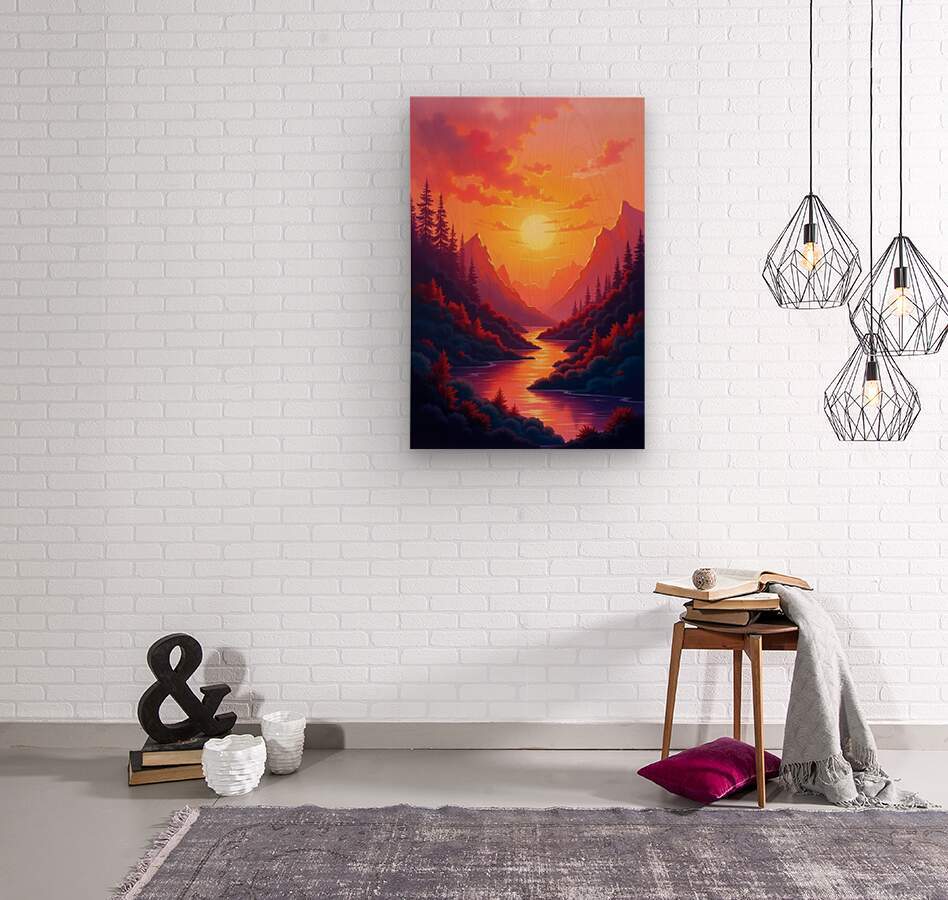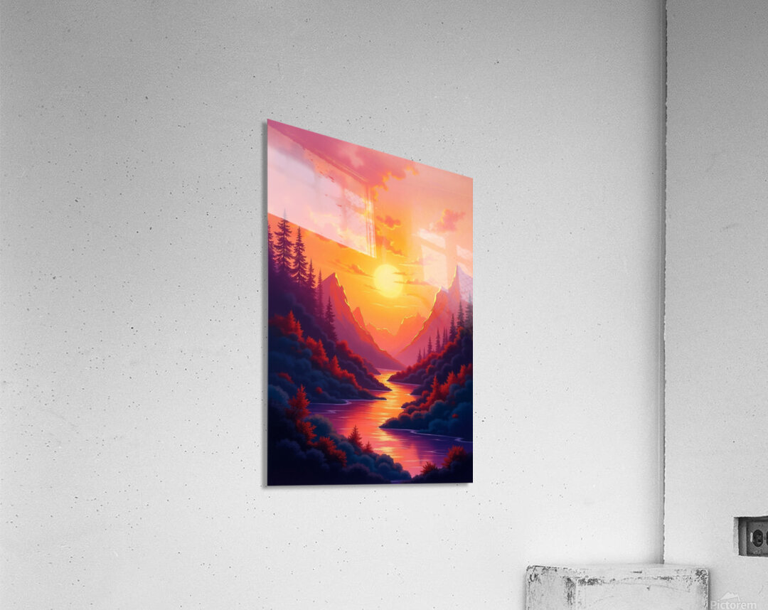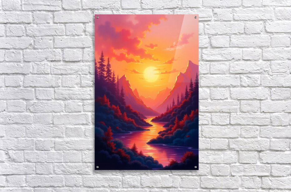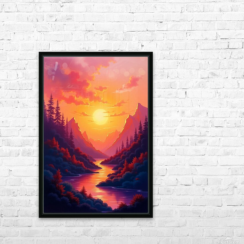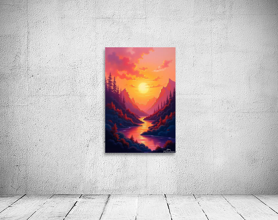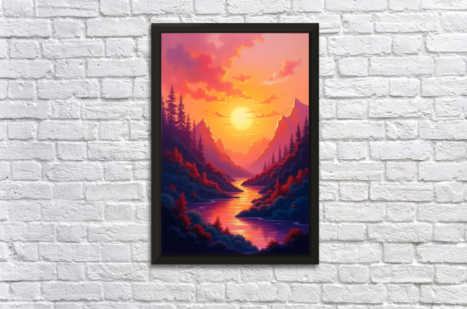 Radiant Wilderness – Sunset River in a Surreal Mountain Valley Wall Decor Frame