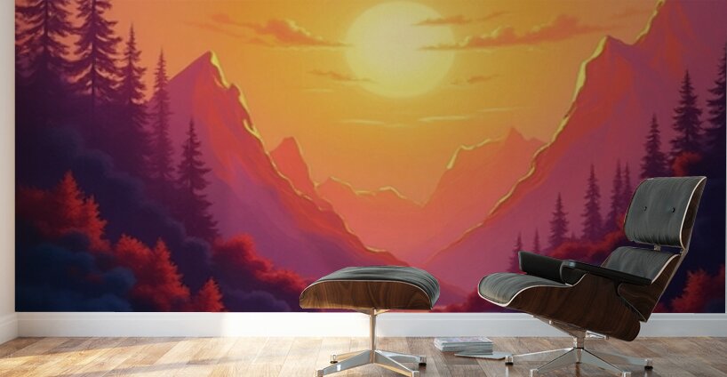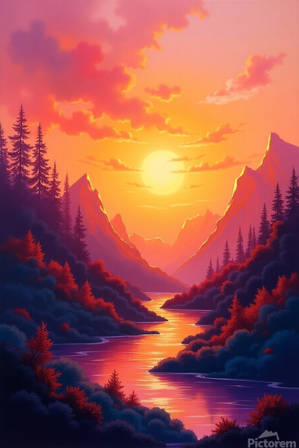 Immerse yourself in the ethereal glow of "Radiant Wilderness," a surreal landscape artwork capturing the golden magic of a mountain sunset. A luminous river winds through deep valleys flanked by towering peaks and vibrant trees, bathed in pink, orange, and purple hues. This piece blends realism and fantasy, evoking both serenity and awe. Ideal for art lovers seeking bold, colorful nature scenes that ignite the imagination and elevate any space.