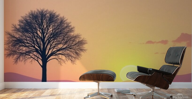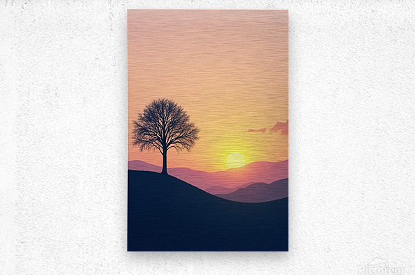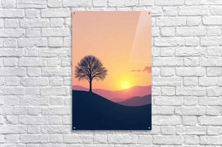 “Solitude at Dusk” captures the quiet beauty of a single bare tree standing against rolling hills as the sun gently sets behind the horizon. This minimalist artwork evokes peace and introspection, blending soft pastels of gold, mauve, and lilac in a dreamy gradient sky. The strong silhouette of the tree adds emotional depth to the composition, making it a perfect wall art choice for calm, meditative spaces or minimalist interiors.