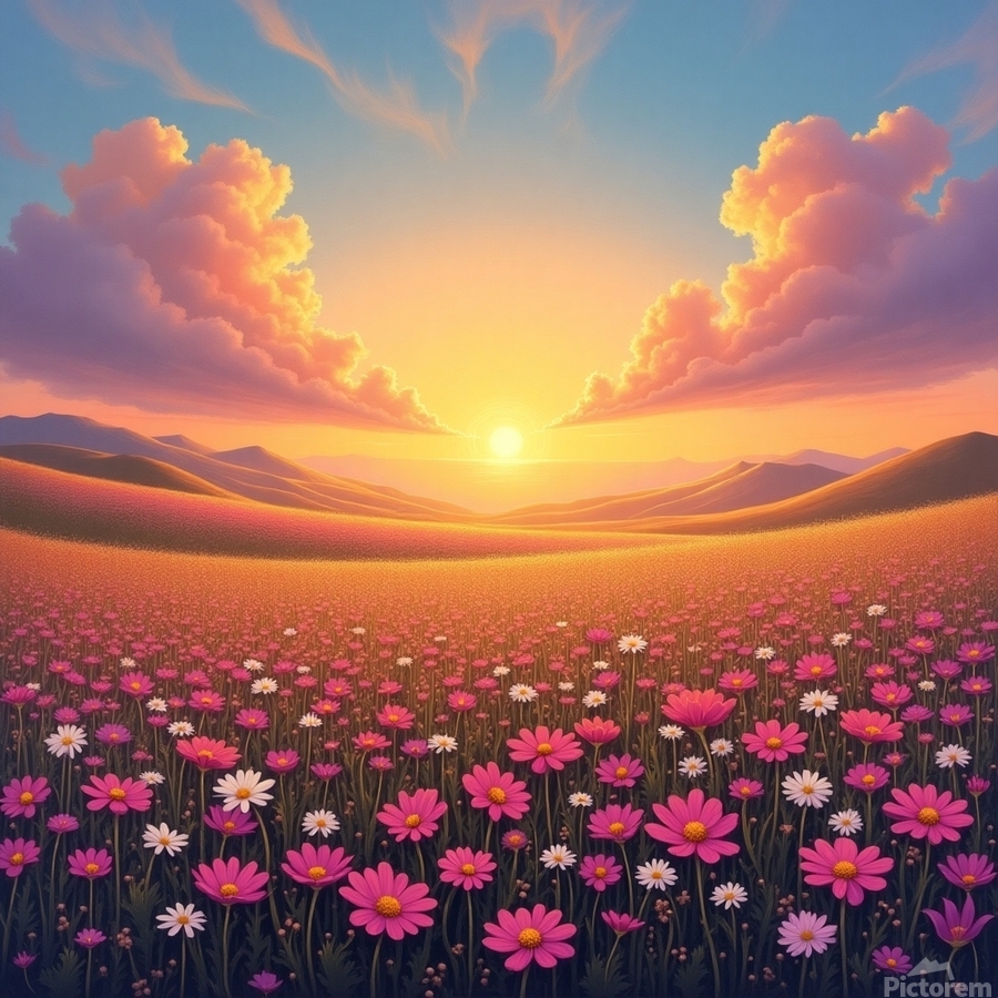 “Golden Bloom” is a radiant celebration of nature’s charm, capturing a vivid field of wild daisies and pink cosmos beneath a glowing sunset. The...[+]
