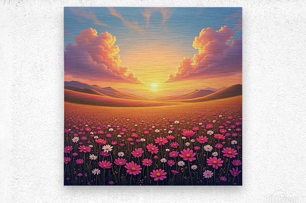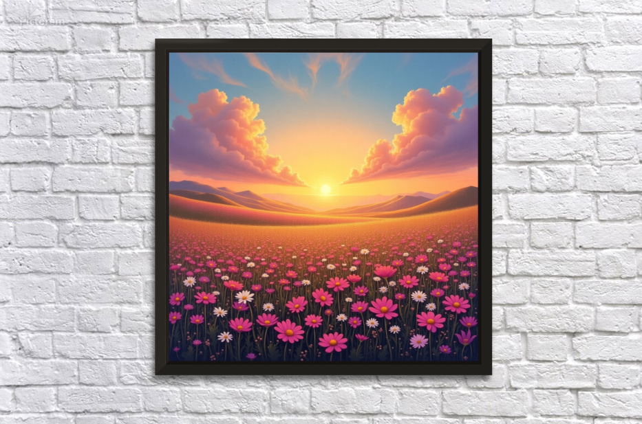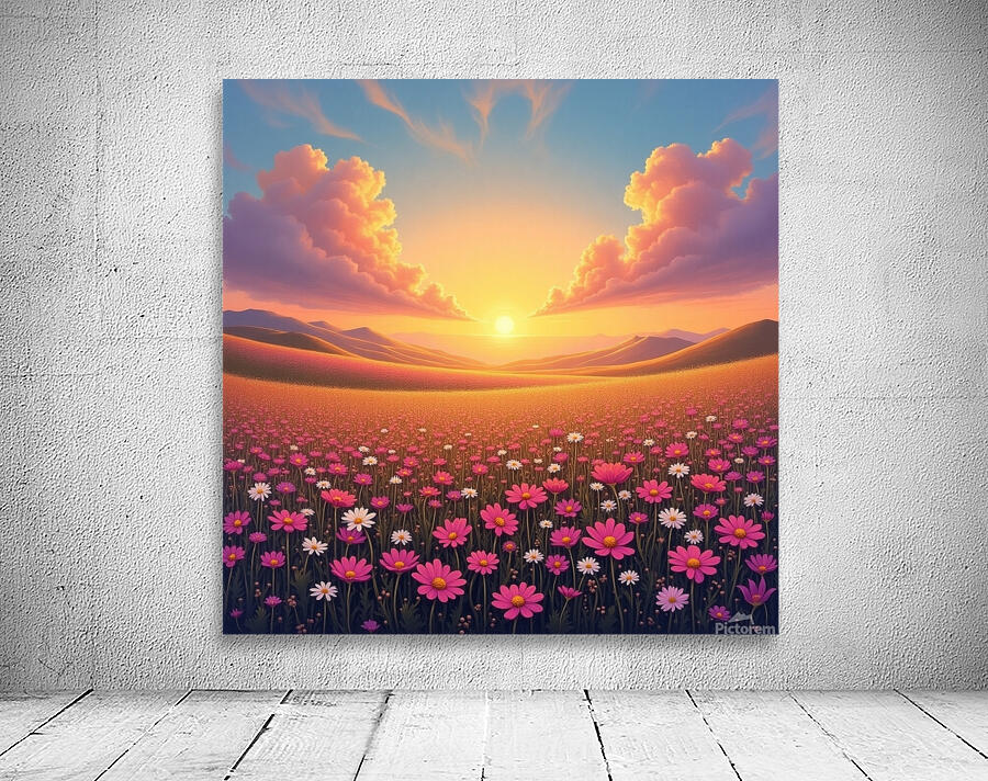 “Golden Bloom” is a radiant celebration of nature’s charm, capturing a vivid field of wild daisies and pink cosmos beneath a glowing sunset. The rolling hills and dreamy clouds frame the golden sun as it dips behind the horizon, bathing the landscape in warmth. This artwork blends realism with whimsical tones, making it perfect for uplifting interior décor, nature lovers, or anyone seeking a joyful splash of color and light.