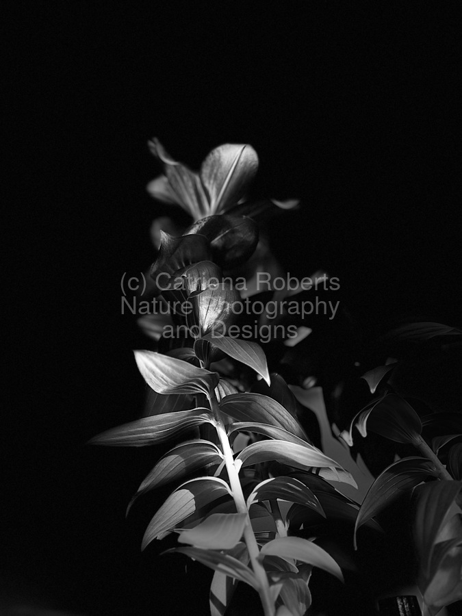 A black and white photo featuring light dramatically illuminating Lily plants with glossy leaves against a dark background. The focus on the leaves creates a striking contrast, highlighting the natural beauty and form of the plant.