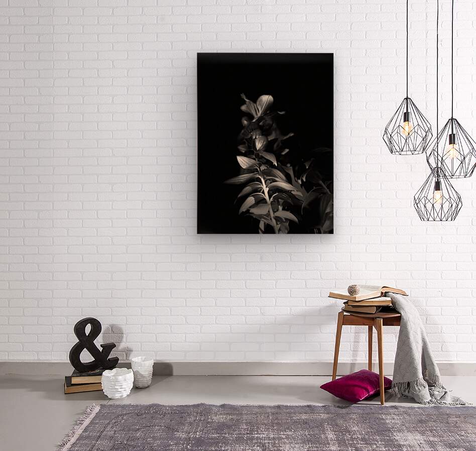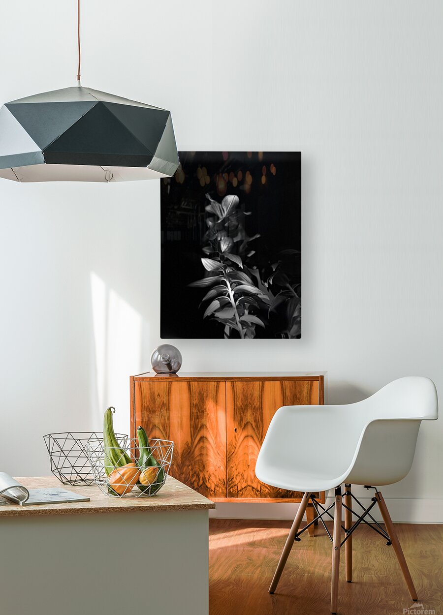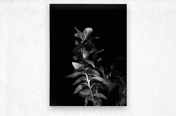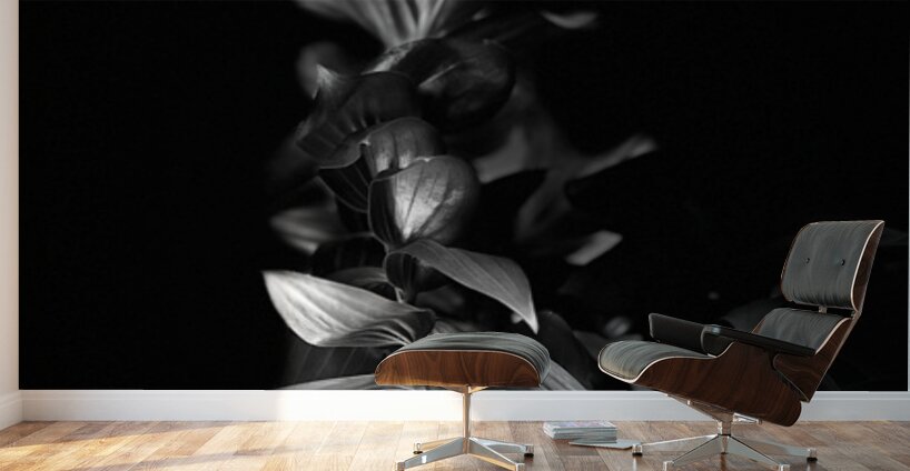 A black and white photo featuring light dramatically illuminating Lily plants with glossy leaves against a dark background. The focus on the leaves c...[+]
