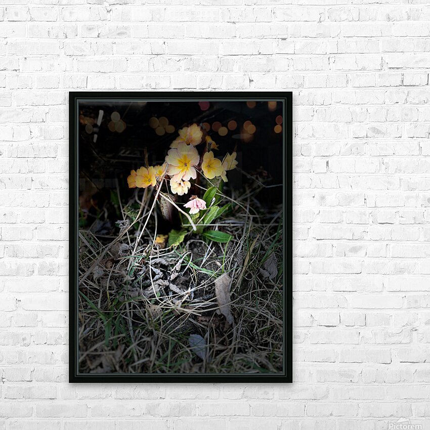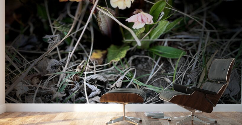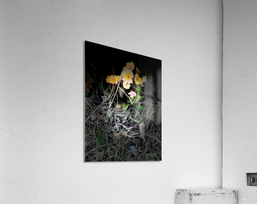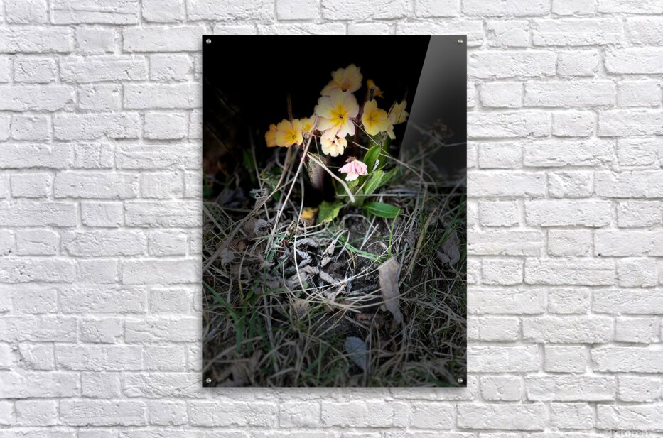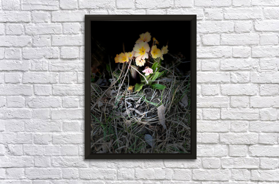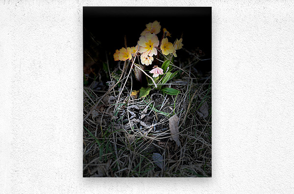 A coloured photo featuring delicate yellow spring Primroses with hints of pink bloom amidst dry grass and faded leaves, creating a contrast between vibrant life and the surrounding decay. Illuminated softly from above, the scene captures a moment of natural beauty.
