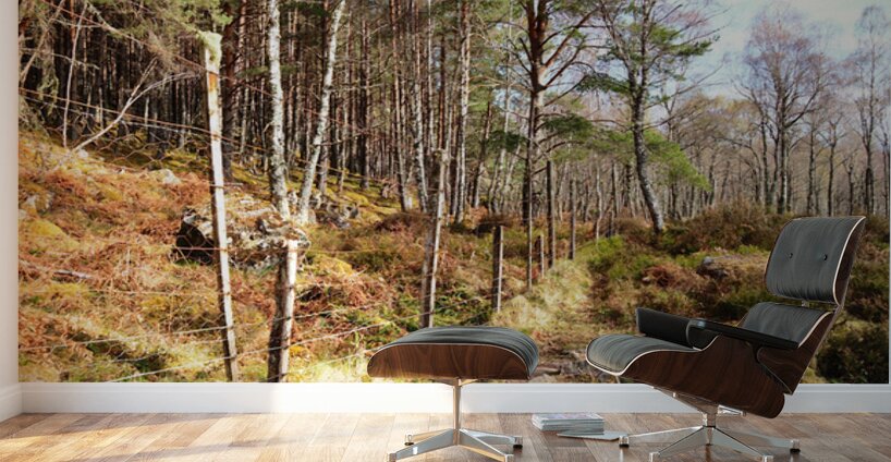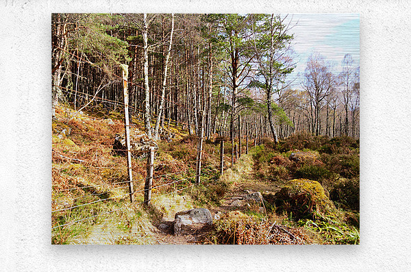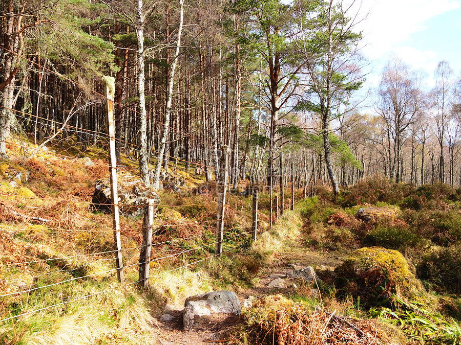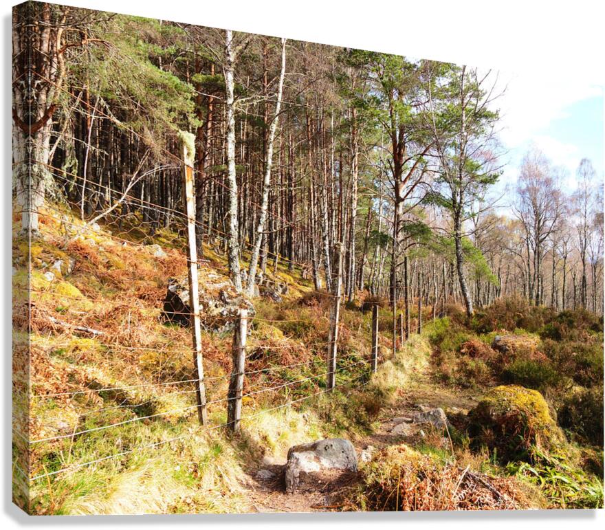 I took this photo during a lovely spring nature walk through the Scottish Highlands. Features a winding path meandering through a dense forest, with a rustic wire fence running alongside it. Sunlight filters through the tall trees, casting dappled shadows on the ground covered in ferns and rocks.