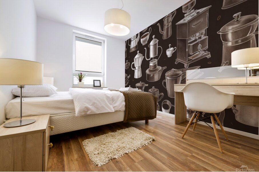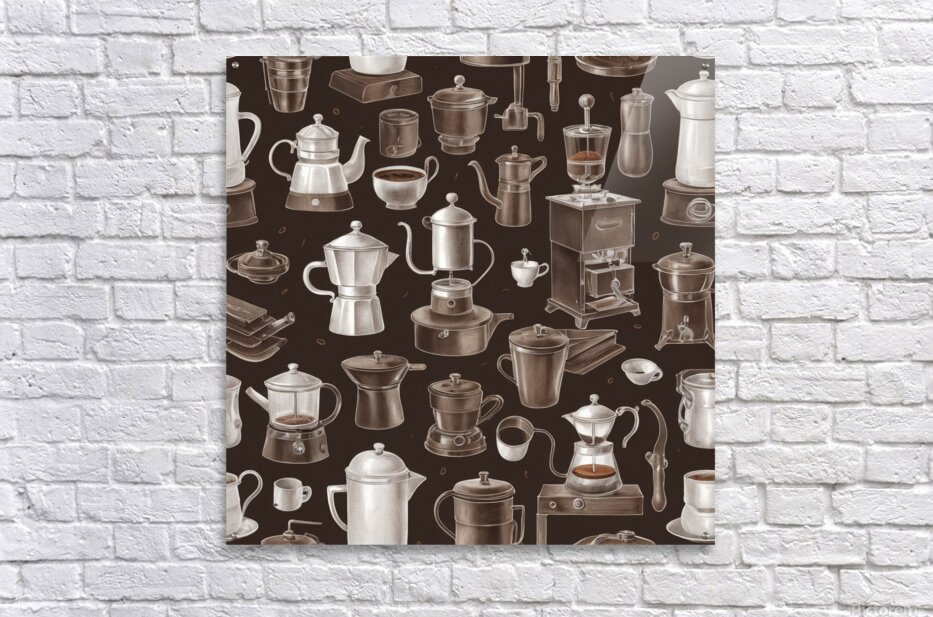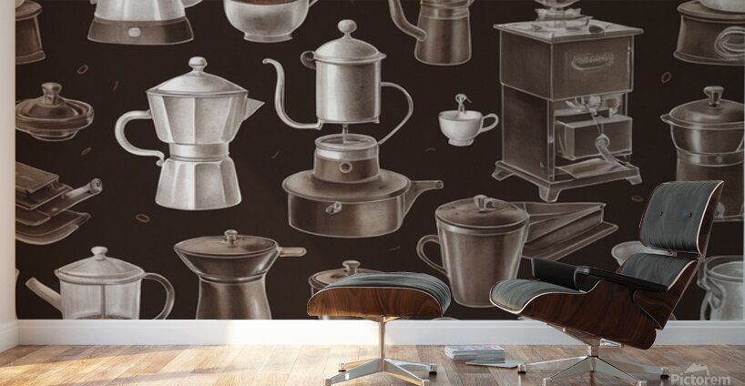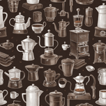 A vintage-style illustration featuring various coffee-making tools and methods on a solid brown background. The design includes detailed, hand-drawn w...[+]