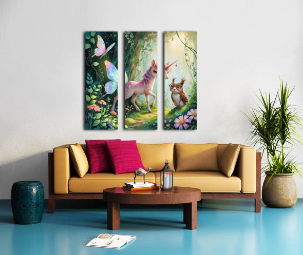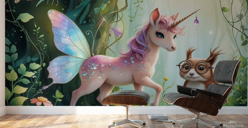 A dreamy forest scene featuring a sparkling pink unicorn, a wise owl with glasses, and a magical butterfly. The enchanting style is reminiscent of Dmi...[+]