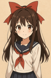 A sweet anime girl with long brown hair and warm amber eyes smiles softly, wearing a sailor-style school uniform and a red bow. A character design ins...[+]