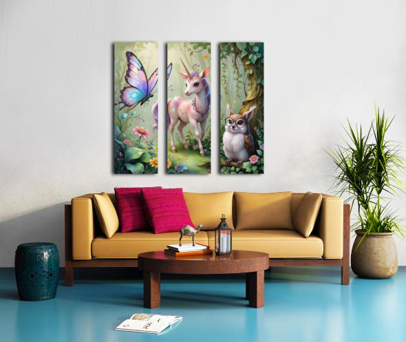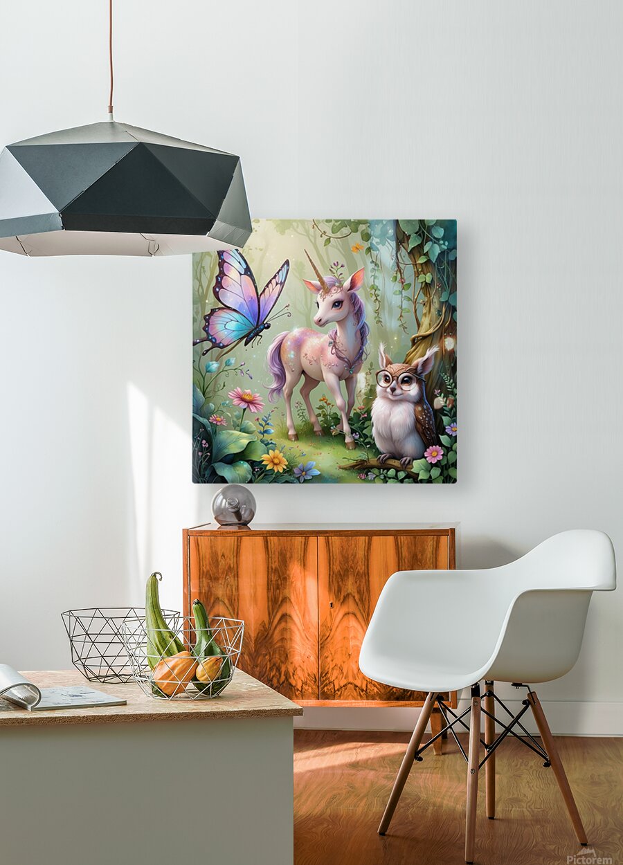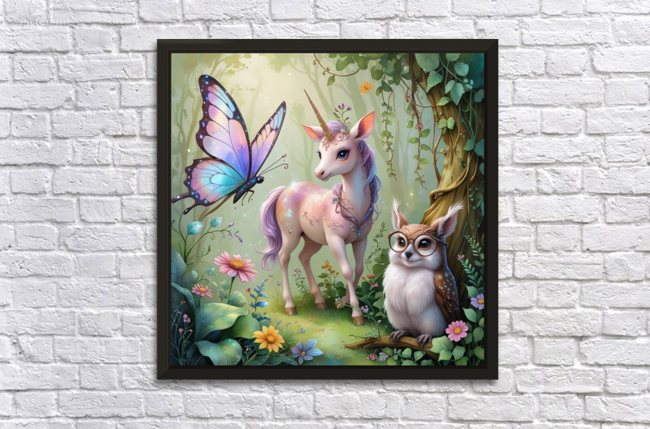A graceful unicorn with a floral crown and a baby deer are joined by a curious owl under a glowing forest canopy. The soft colors and sparkling detail...[+]
