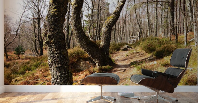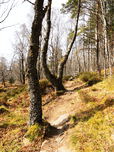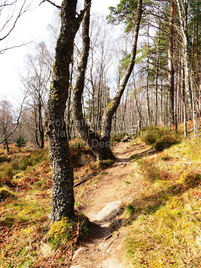I took this photo during a lovely nature walk through the Scottish Highlands. Features a winding dirt path meandering through a woodland area, surrounded by tall, leafless Birch trees and patches of greenery. Sunlight filters through the branches, highlighting the natural landscape and rustic trail.
