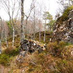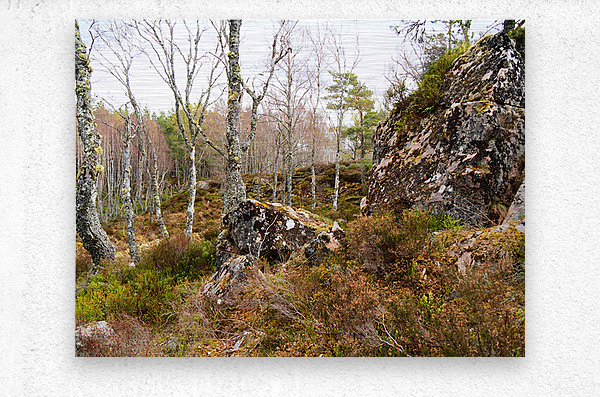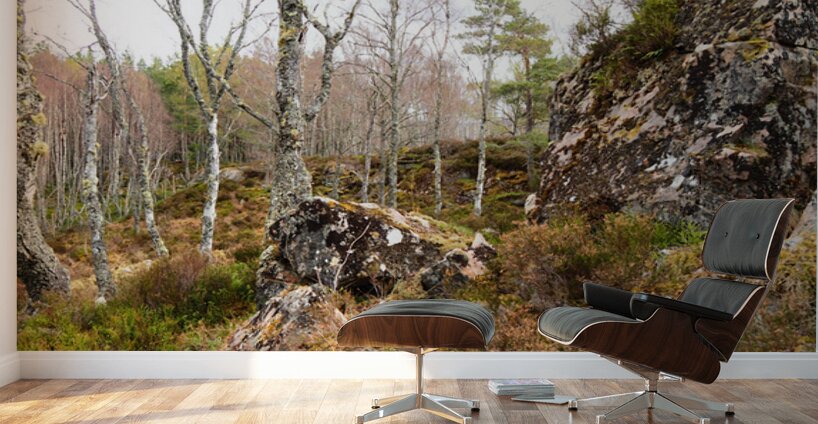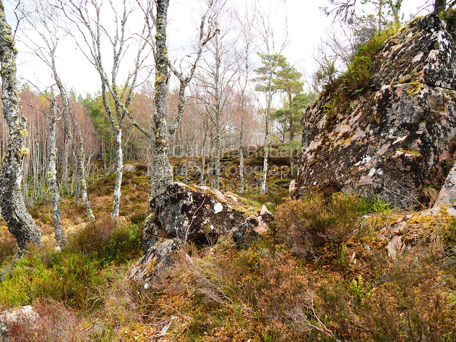 I took this photo during a lovely spring nature walk through the Scottish Highlands. Features a serene forest landscape with tall, slender Birch trees with sparse foliage, interspersed with large, rugged boulders covered in moss. The earthy tones and the mix of rocks and greenery suggest a calm yet wild natural environment.