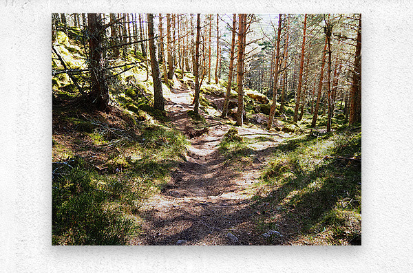 I took this photo during a lovely spring nature walk through the Scottish Highlands. Features sunlight filtering through a dense Pine forest canopy, casting dappled shadows on the earthy path below. Tall trees stand on either side, their trunks bathed in warm light.