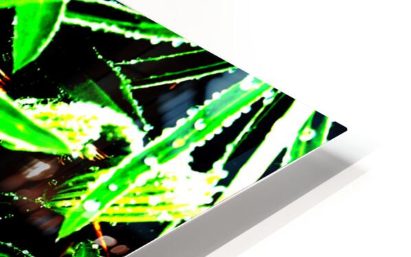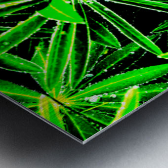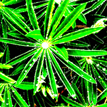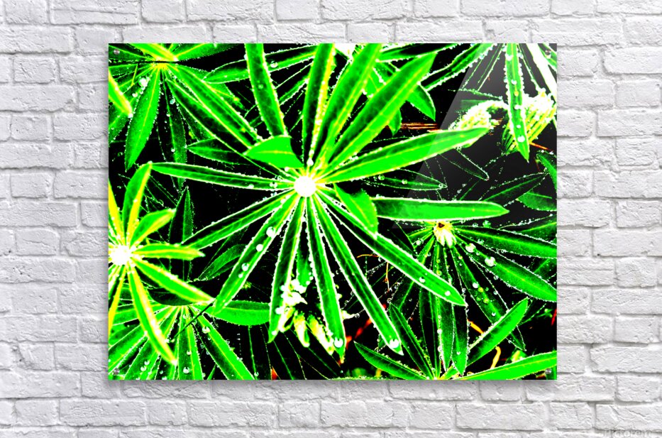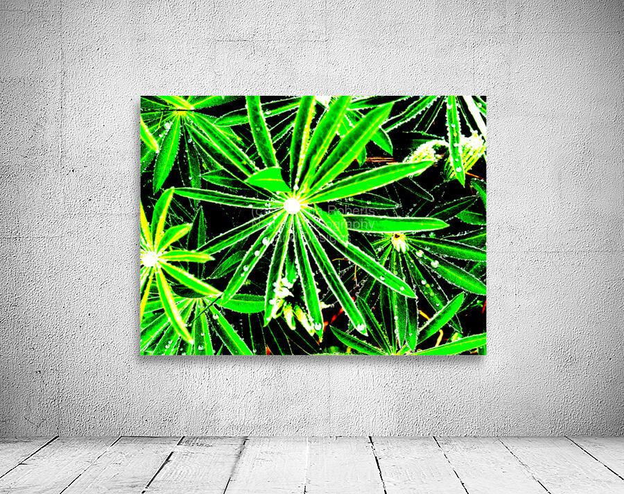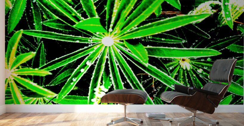 Originally a photo of spring Lupin leaves laterally digitally manipulated into a stunning piece of contemporary botanical art. Features vibrant green leaves radiating from central points, covered with glistening water droplets. The high contrast and vivid colors create a striking visual effect.