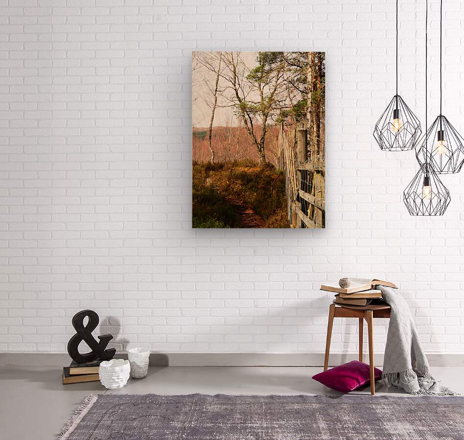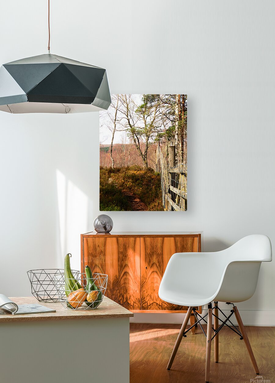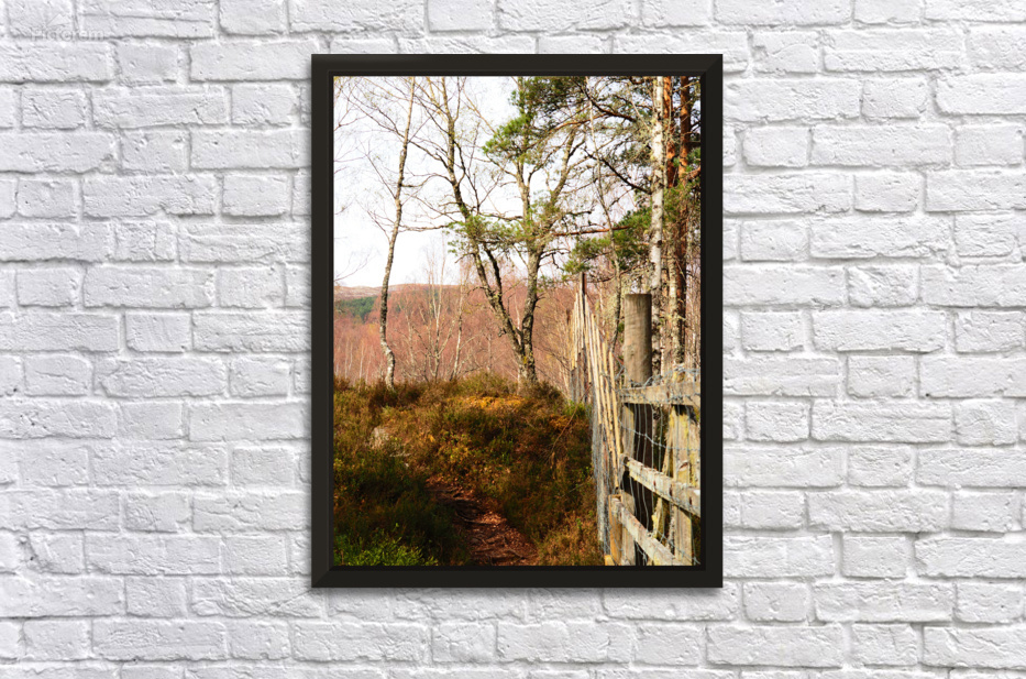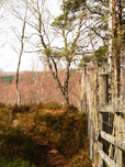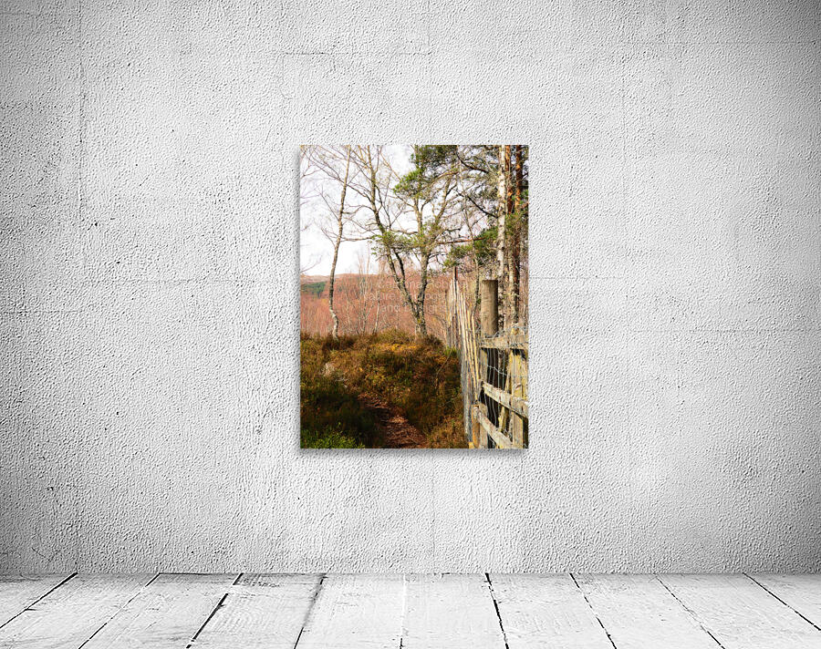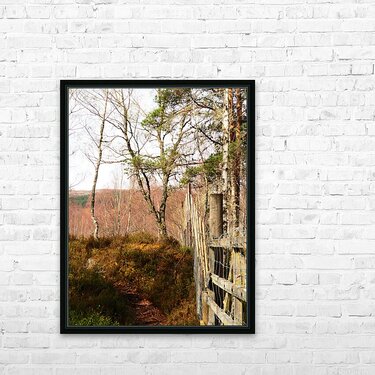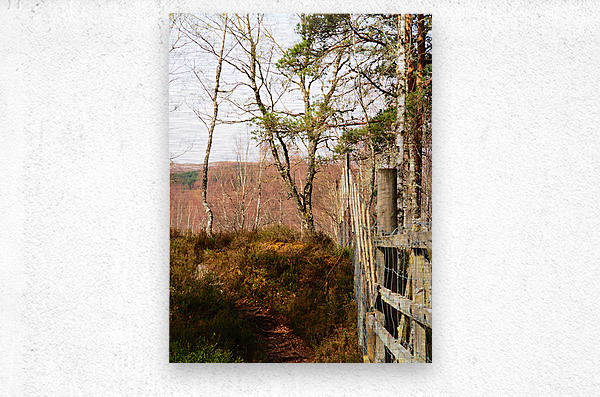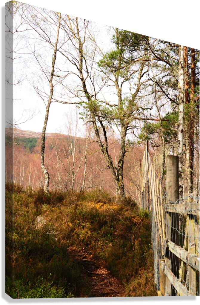 I took this photo during a lovely spring nature walk through the Scottish Highlands. A narrow nature path meanders through a wooded area, with a Deer fence running alongside it. Spring bare Birch trees and Pine trees dominate the view, with the light creating gentle shadows on the ground.