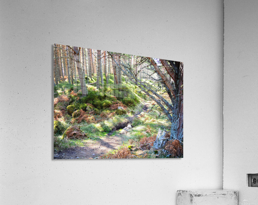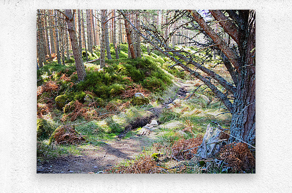 I took this photo during a lovely spring nature walk through the Scottish Highlands. Features sunlight filtering through a dense Pine forest, illuminating a narrow path winding through lush greenery and scattered fallen leaves. The trees stand tall, their trunks creating a pattern of vertical lines amidst the vibrant undergrowth. It's easy to imagine the Fae dancing and laughing as they follow this path.