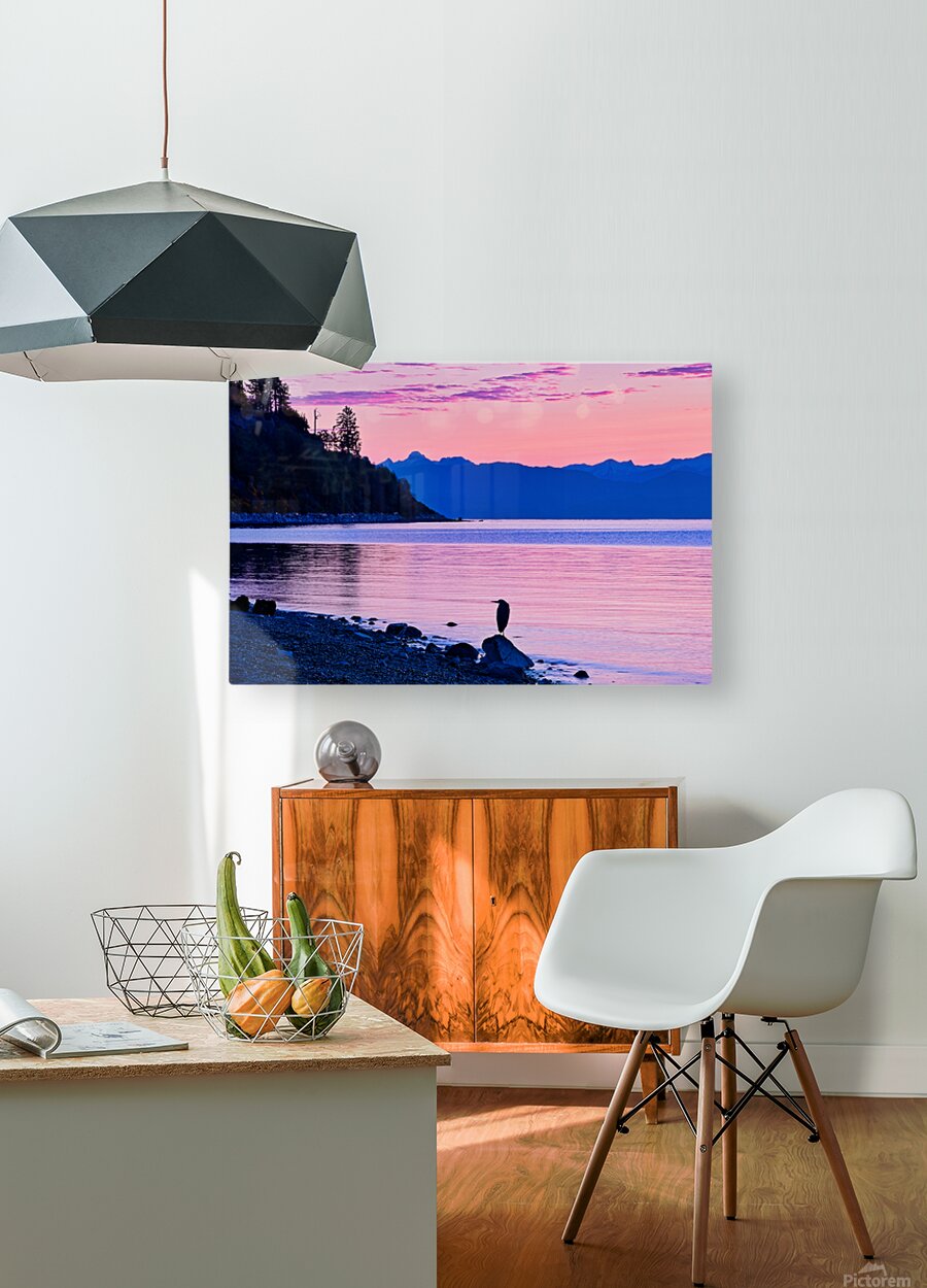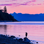 A tranquil scene unfolds at sunrise, with hues of pink and purple reflecting off the calm water. Silhouetted against this colourful backdrop, a solitary heron stands on a rock near the shoreline.