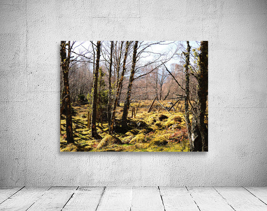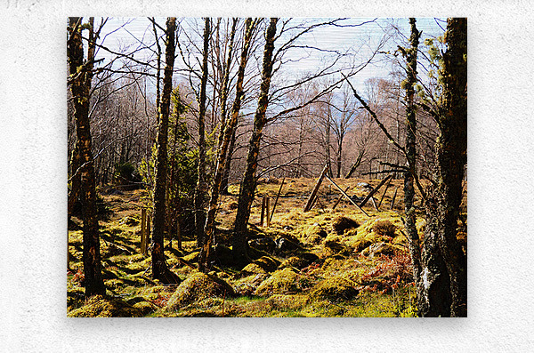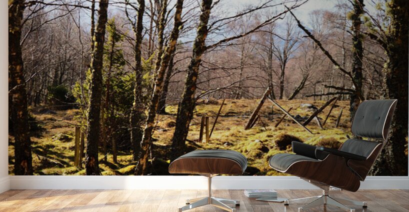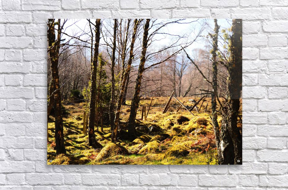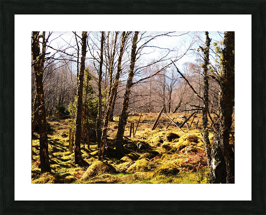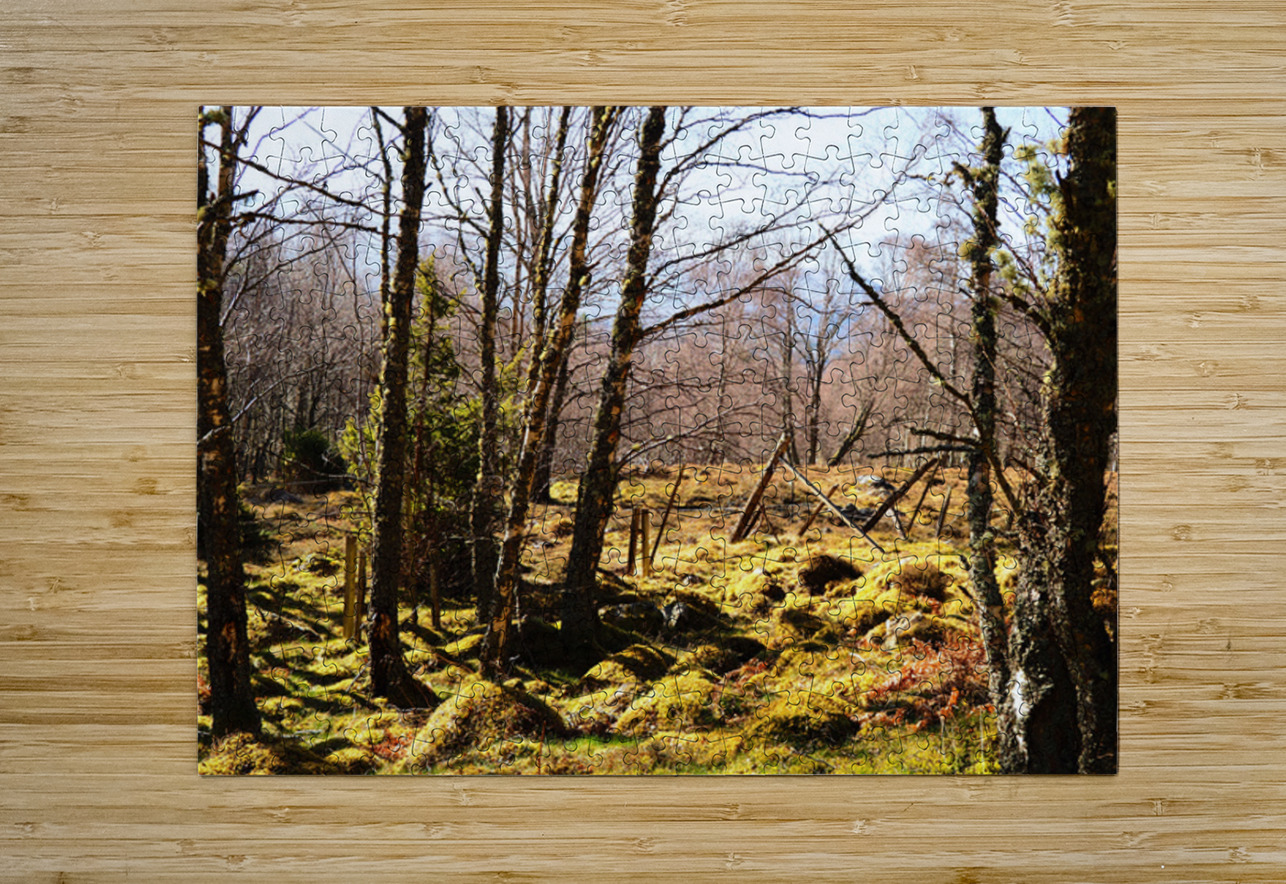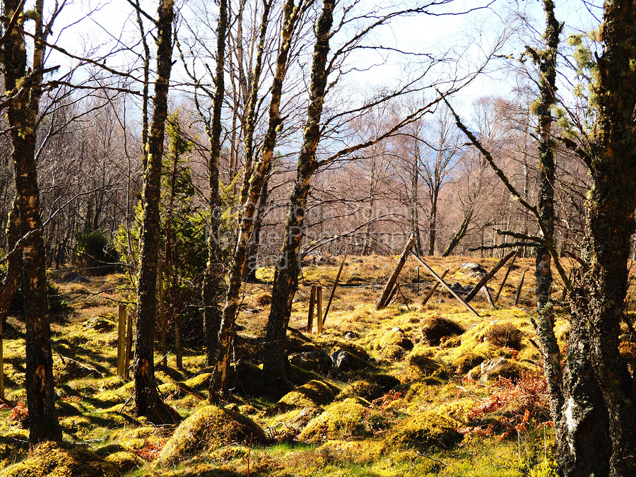 I took this photo during a lovely spring nature walk through the Scottish Highlands. Features sunlight filtering through a dense forest of tall, leafless Birch trees, casting shadows on the moss-covered ground below. An old wooden fence weaves through the underbrush, adding a rustic element to the tranquil scene.