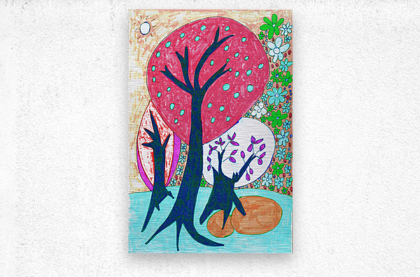 Originally a hand drawn nature inspired design created using coloured ink pens and paper, laterally digitally manipulated into a stunning piece of contemporary nature art. Features a whimsical scene with abstract trees in varying colorful canopies and flower patterns, set against a vibrant background. Bold lines and playful shapes create an imaginative landscape.