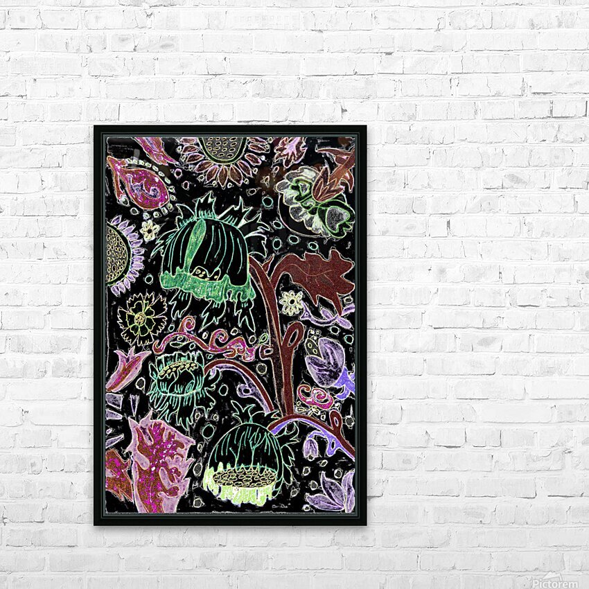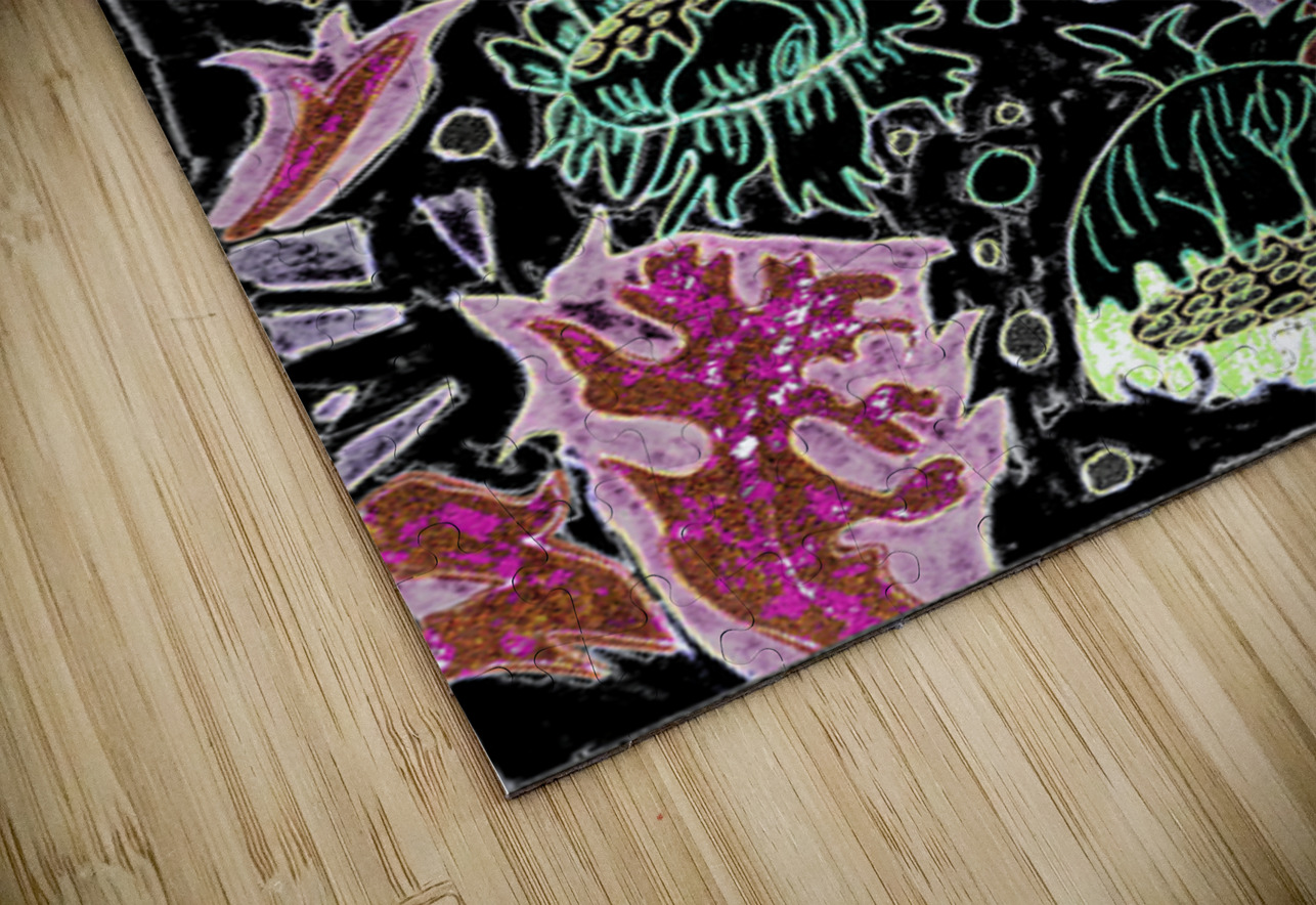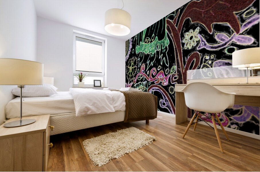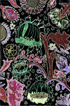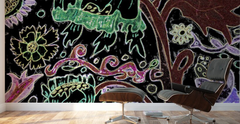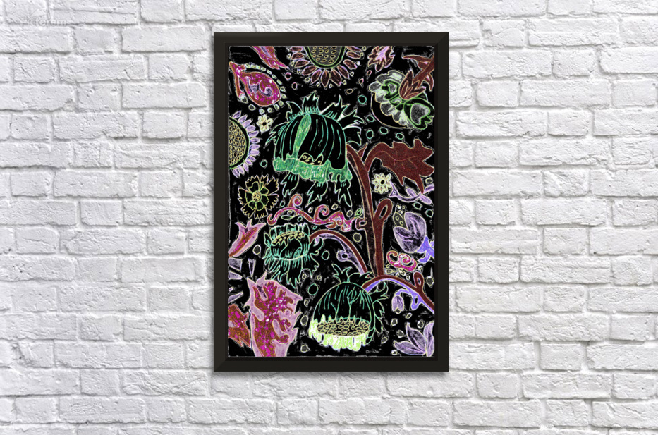 Originally a hand drawn nature inspired design created using coloured ink pens and paper, laterally digitally manipulated to create a piece of contemporary abstract art. Features floral patterns intricately interweaved, showcasing vibrant colors against a dark background. Abstract artistic flowers with distinct shapes create a whimsical and enchanting scene.