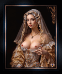Renaissance Portrait Of The Seductive Beauty Lycia Lysandra AI Concept Art by Xzendor7; is a captivating half-length depiction of a seductive partially nude woman imbued with an air of quiet intimacy and refined elegance. Set against a backdrop of deep shadow, the artwork evokes the sensibilities of masters like Titian and Rubens through its masterful handling of light, fabric, and form. Lycia Lysandra’s gaze meets the viewer's directly, while her pose, relaxed yet composed, draws attention to the elaborate details of her attire and the delicate textures rendered with remarkable skill. The painting is a celebration of beauty, artistry, and meticulous observation characteristic of Renaissance portraiture, offering a glimpse into a world of opulent fabrics, shimmering jewels, and subtle expression. Read The Story At: https://xzendor7.com/renaissance-portrait-seductive-beauty-lycia-lysandra/