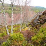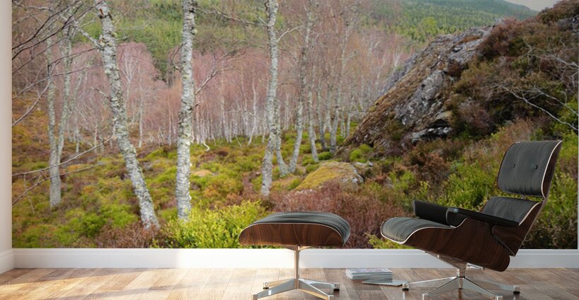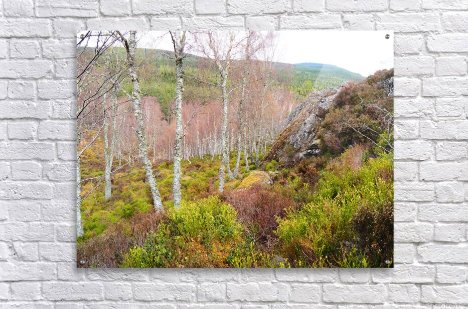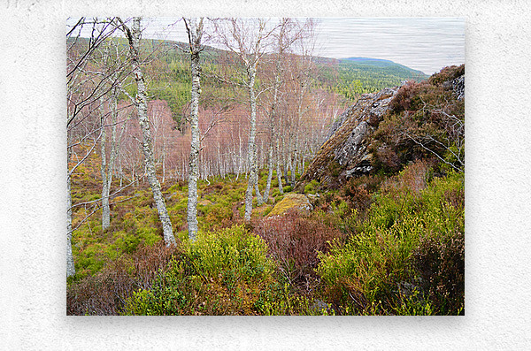 I took this photo during a lovely Spring walk through the Scottish Highlands. Features Birch trees standing tall in a lush, green landscape, with a rocky formation adding texture to the scene. The backdrop of rolling hills and vibrant vegetation created a serene natural setting.