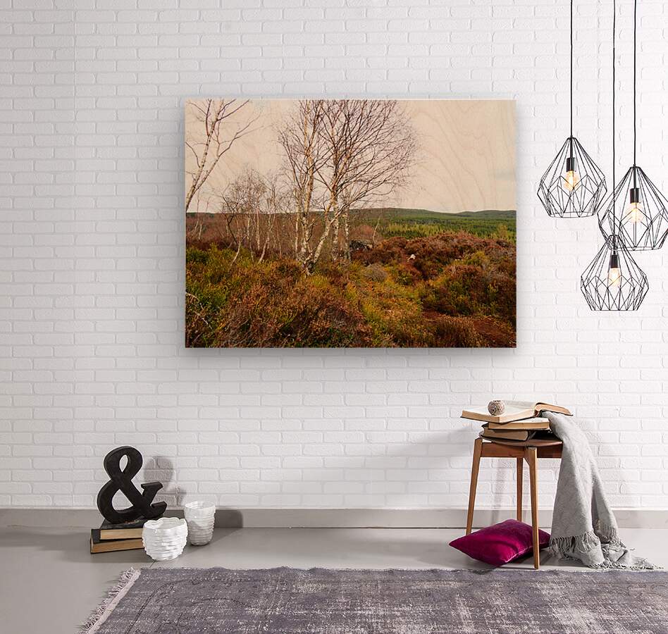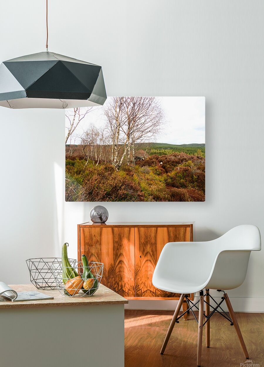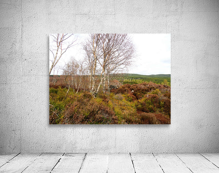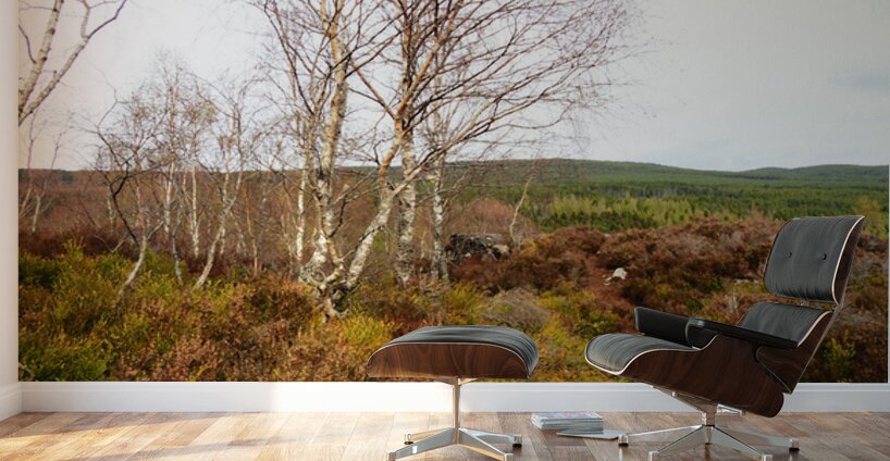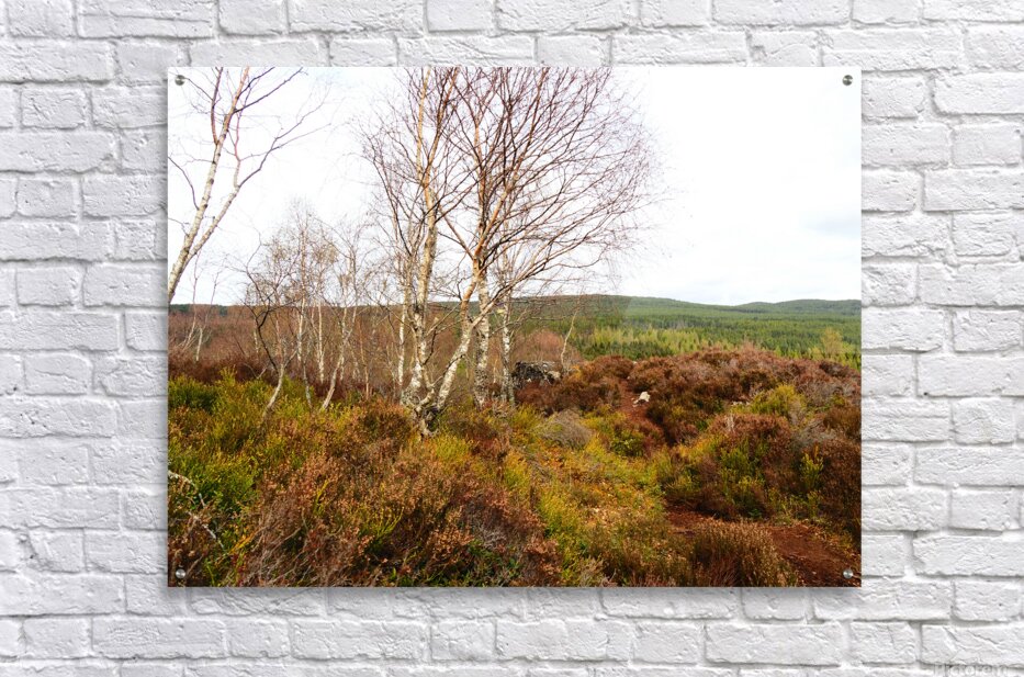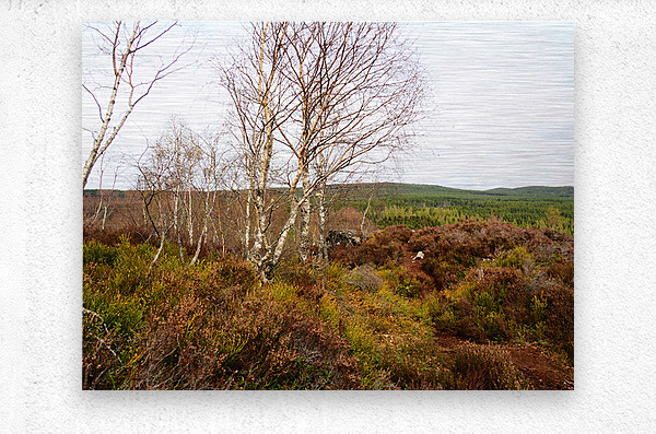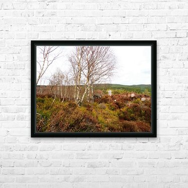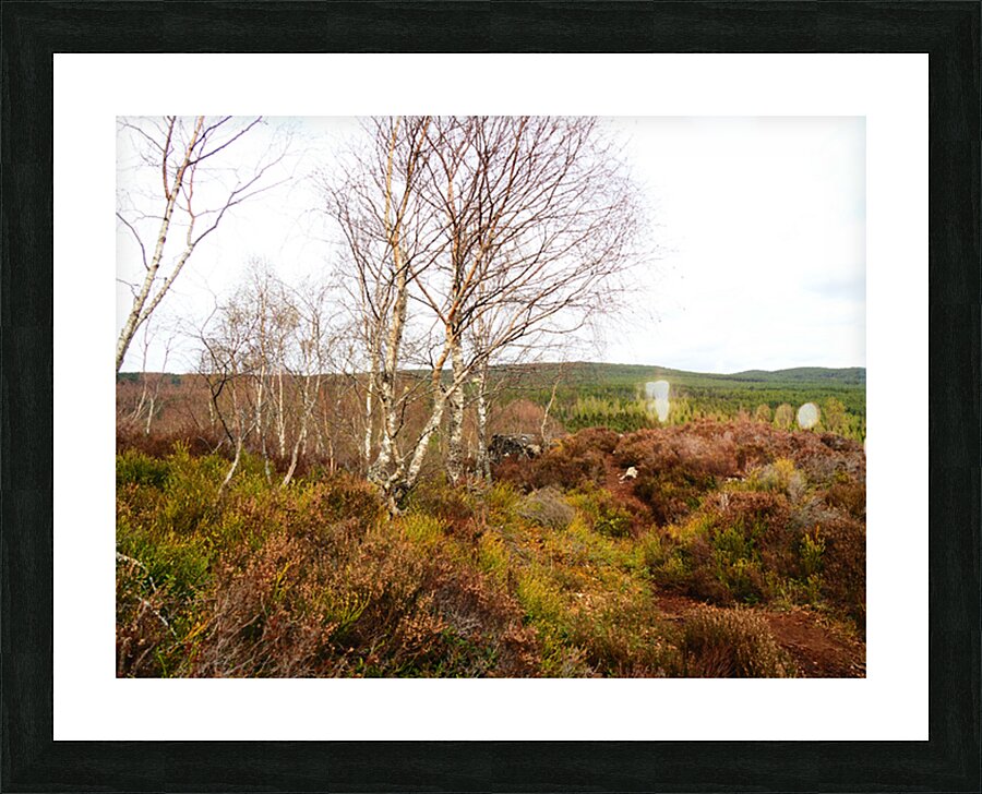 I took this photo during a lovely Spring nature walk through the Scottish Highlands. Features bare Birch trees standing amidst a landscape of dense shrubs and grasses, extending towards distant green hills under a softly lit sky. The scene captures the serene transition from forest to open heathland.