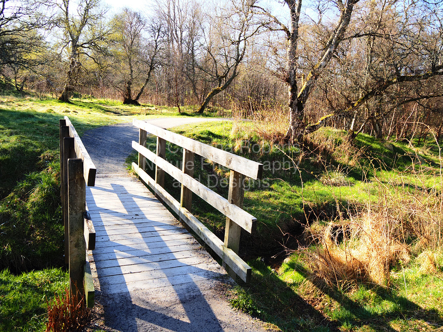 I took this photo during a lovely Spring nature walk through the Scottish Highlands. Features a wooden footbridge leading across a small stream, surro...[+]