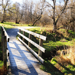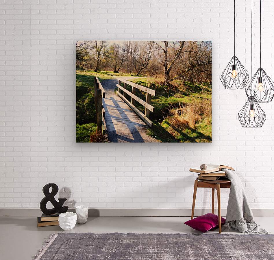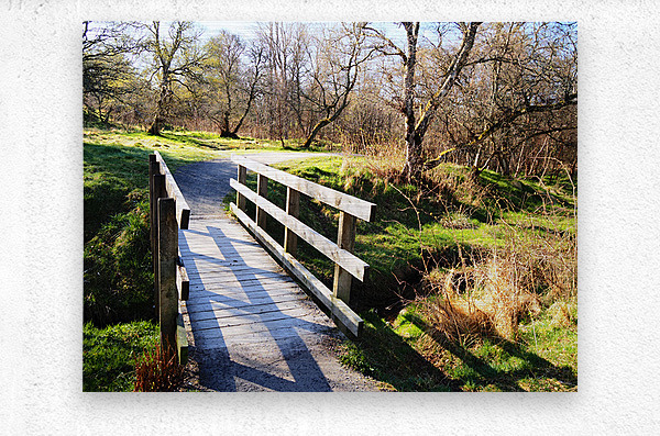 I took this photo during a lovely Spring nature walk through the Scottish Highlands. Features a wooden footbridge leading across a small stream, surrounded by a lush, sunlit landscape of grass and leafless trees. Long shadows stretch across the path, indicating the low angle of the sun, enhancing the tranquil setting.