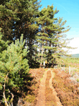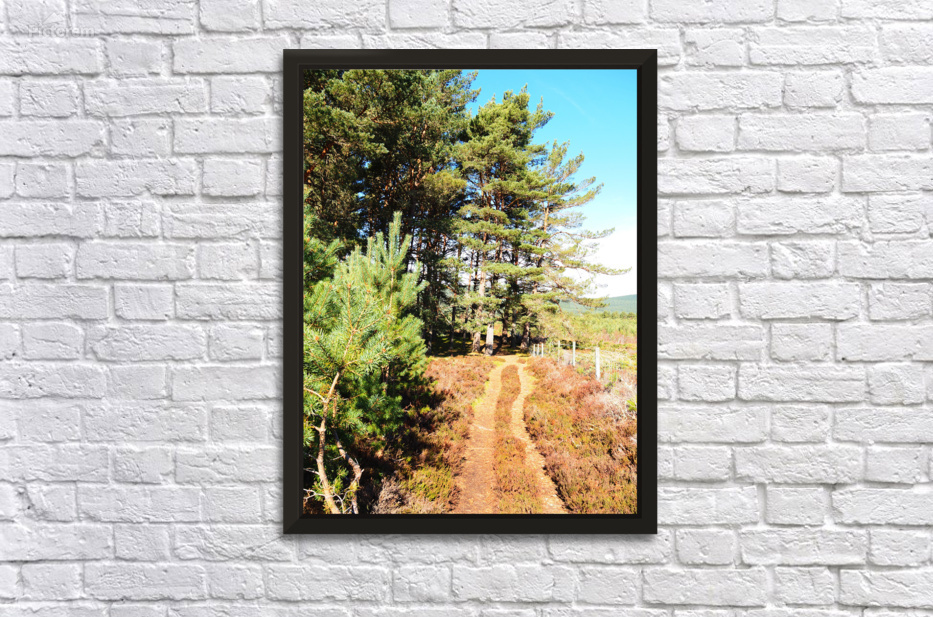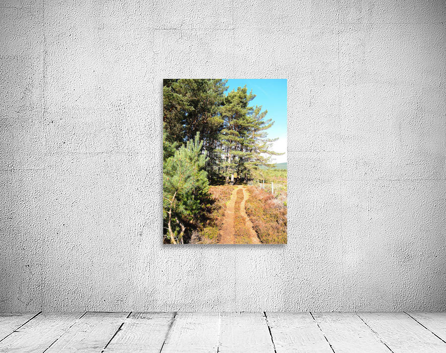 I took this photo during a lovely Spring nature walk through the Scottish Highlands. Features a dirt path winding through a lush forested area, surrounded by tall green Pine trees under a clear blue sky. The scene evokes a sense of tranquility and natural beauty, inviting exploration.