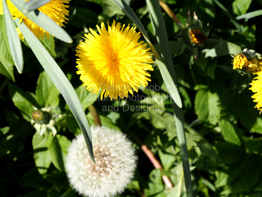 I took this photo during a lovely Spring nature walk through the Scottish Highlands. Features bright yellow dandelions and a fluffy white seed head standing out against a backdrop of green leaves. The scene captures the contrast between the vibrant flowers and the softness of the seed head.