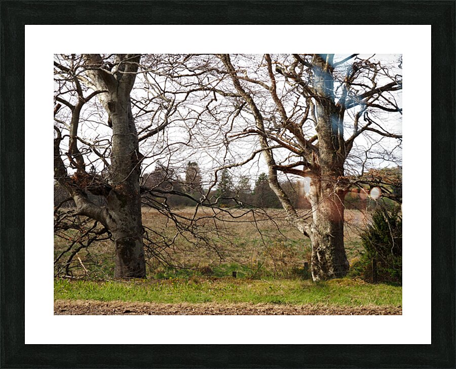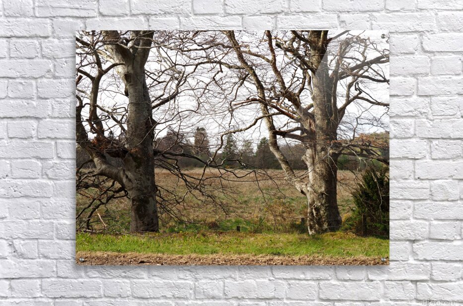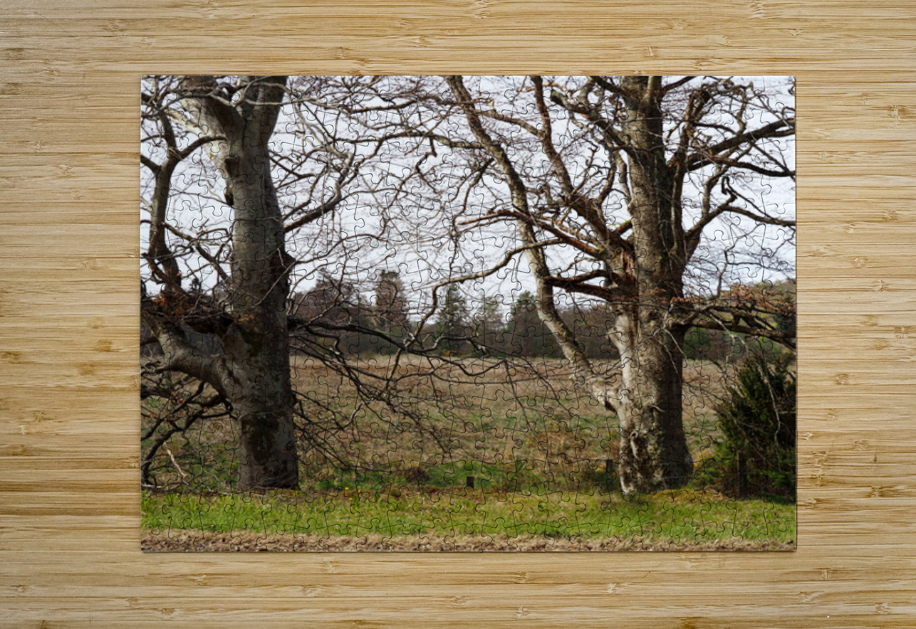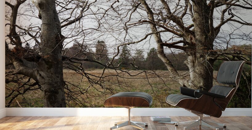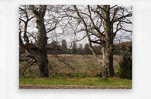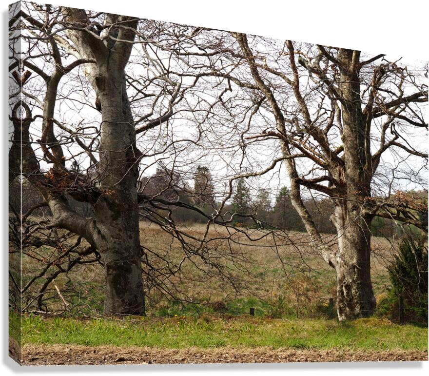 I took this photo during a lovely Spring nature walk through the Scottish Highlands. Features two large trees with intricate branches extending across a grassy field, their leafless limbs creating a network against the sky. In the background, a dense line of trees outlines the horizon under a soft, overcast light.