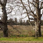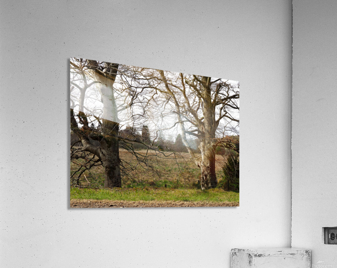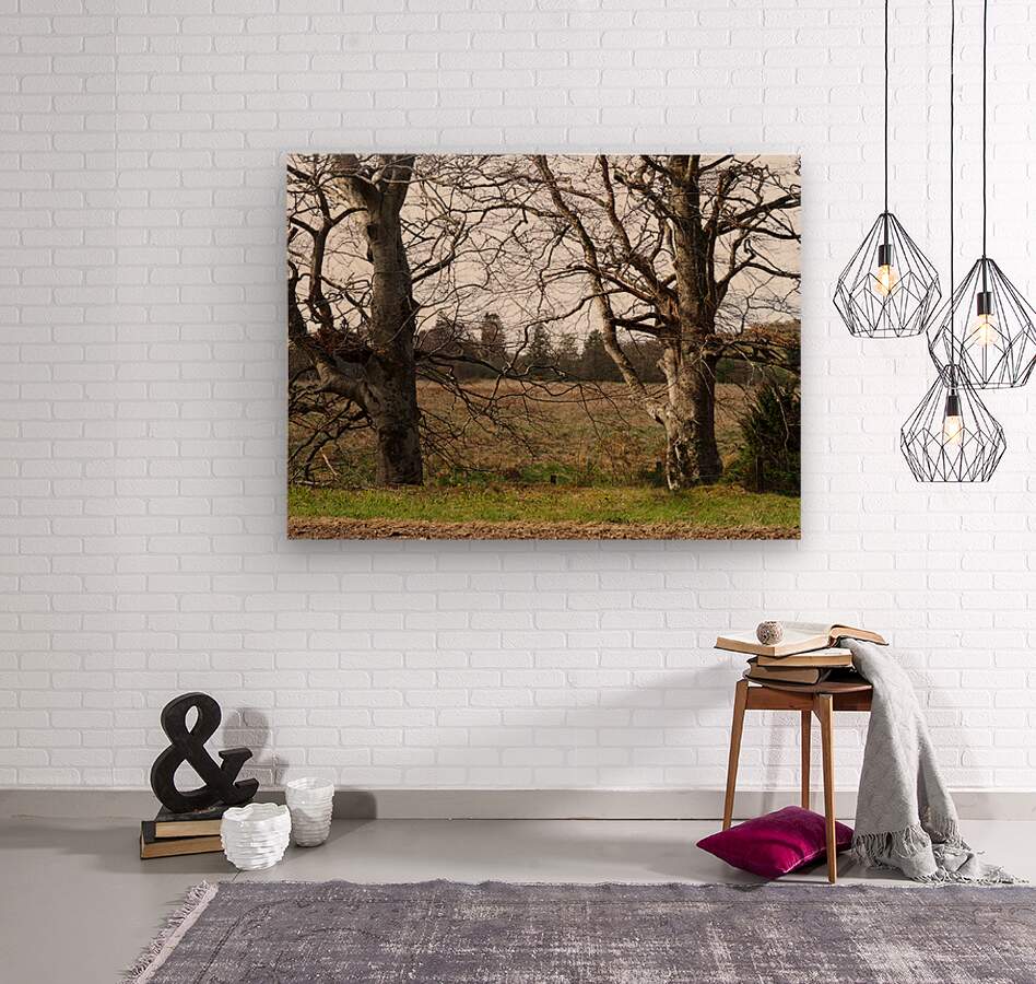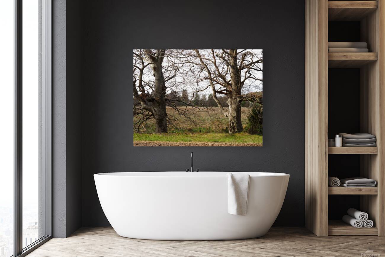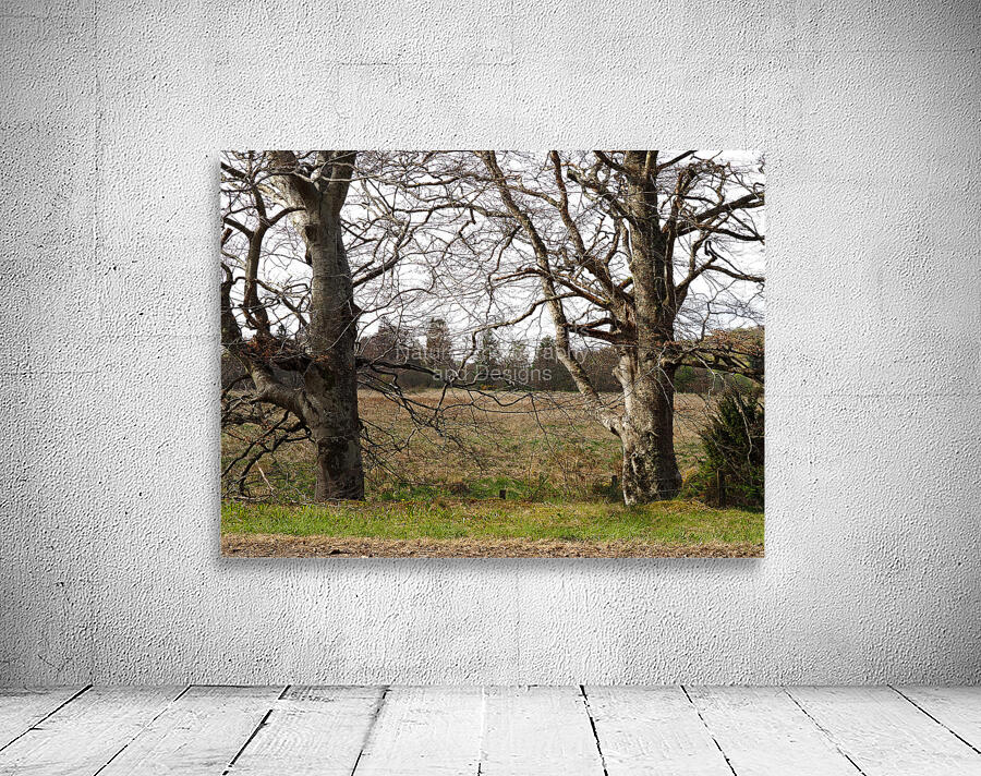 I took this photo during a lovely Spring nature walk through the Scottish Highlands. Features two large trees with intricate branches extending across a grassy field, their leafless limbs creating a network against the sky. In the background, a dense line of trees outlines the horizon under a soft, overcast light.