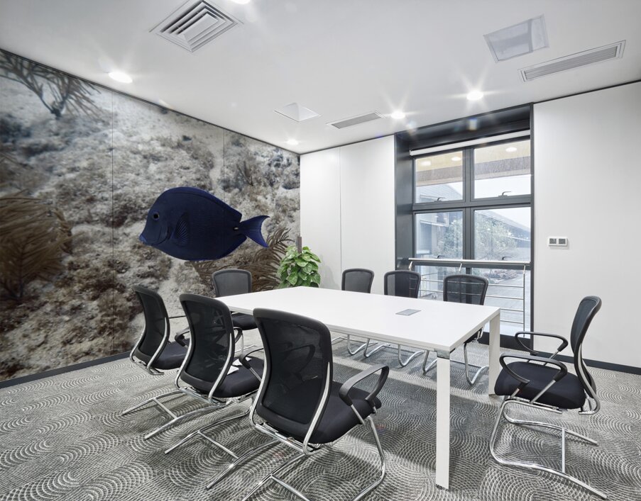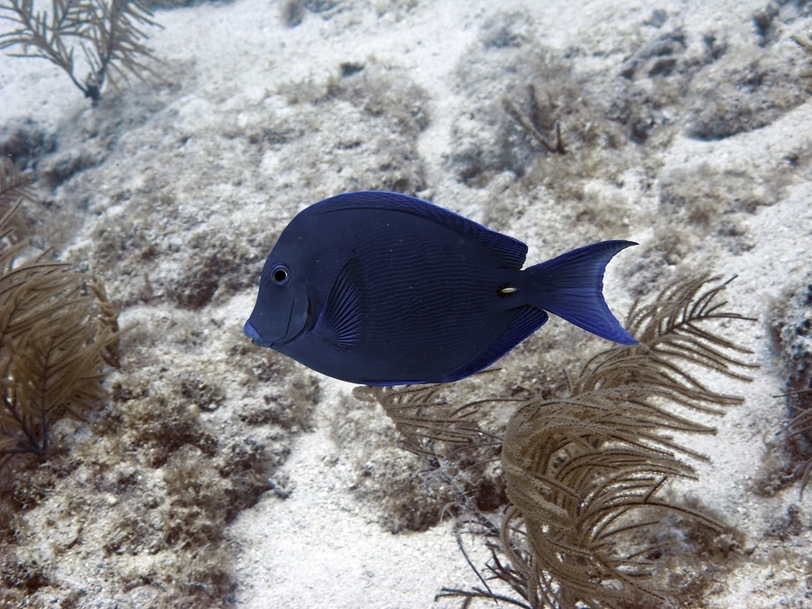 A dark blue fish swims by. Produced specifically by DeepEarth Photography for use in the hospitality industry. No warranties are stated or implied. Credits: DeepEarth Photography