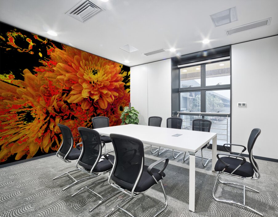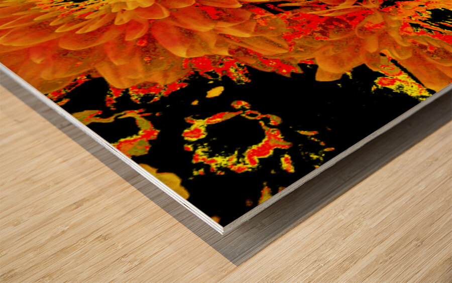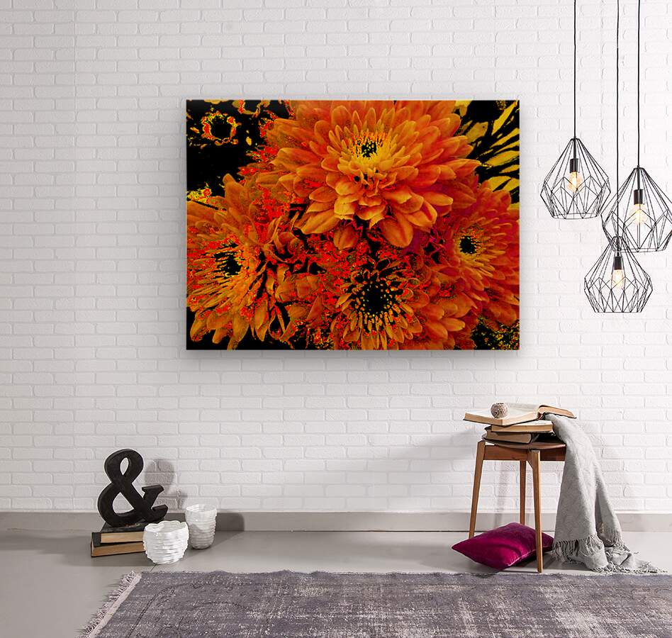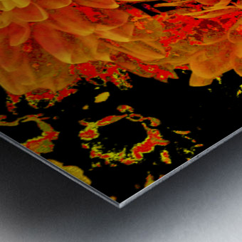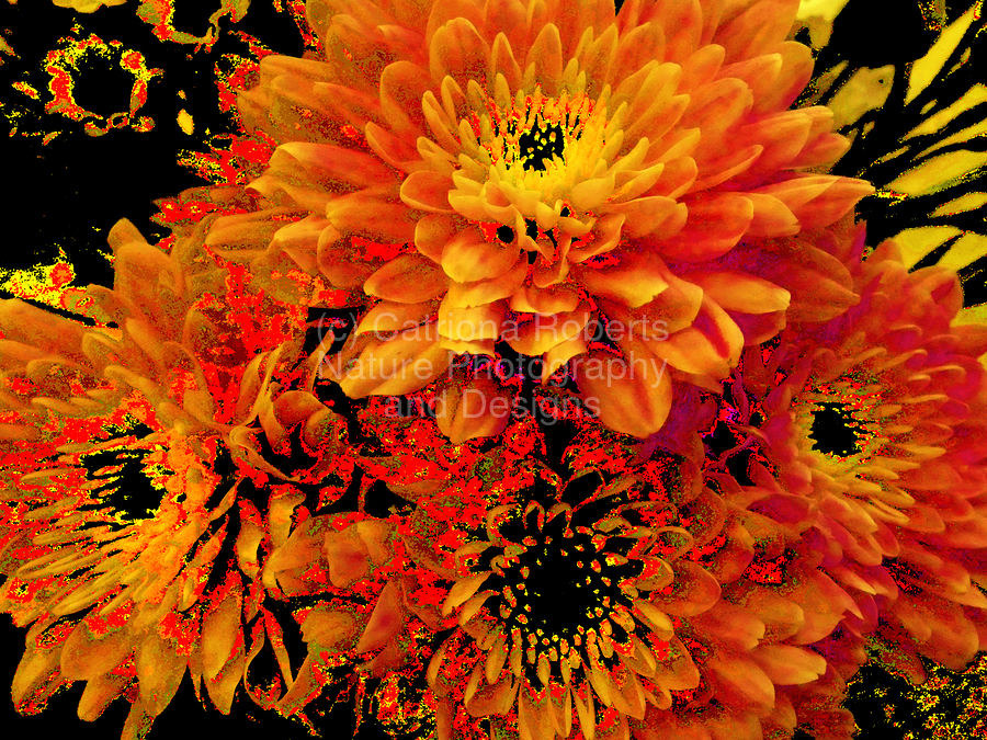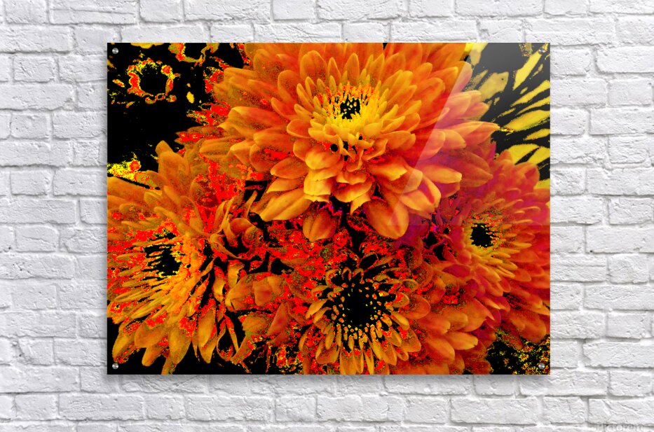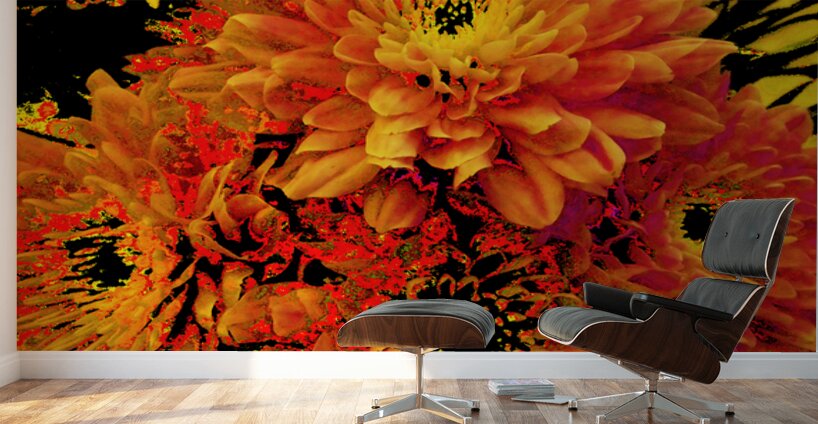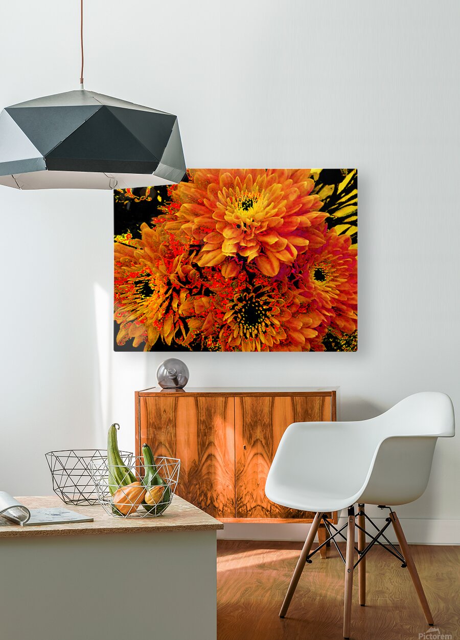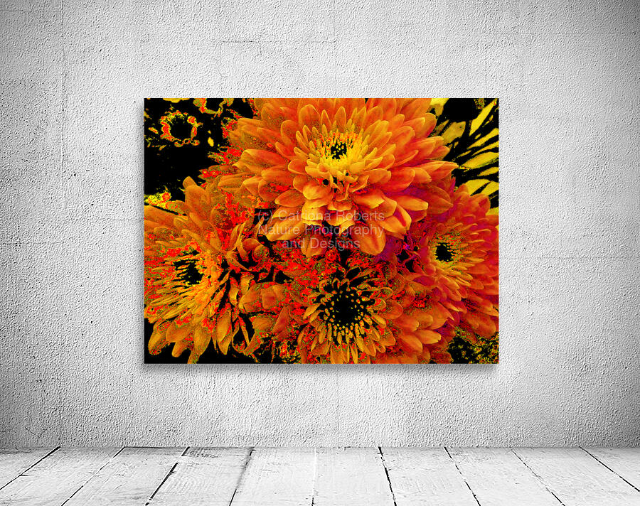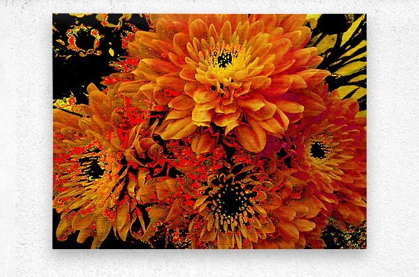 Originally a close up photo of Chrysanthemum flowers, laterally digitally manipulated into a stunning piece of contemporary floral art. Features golden blooms bursting with vibrant, fiery shades of orange and yellow against a dark background, creating a striking contrast. The intricate petal patterns draw attention to the flower's lush fullness.