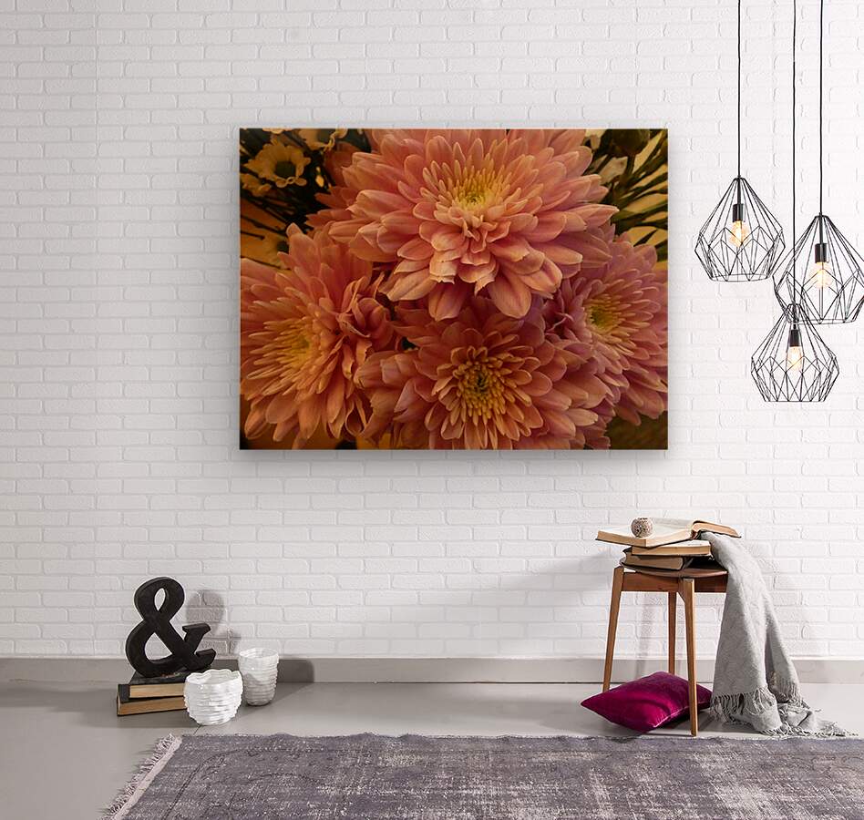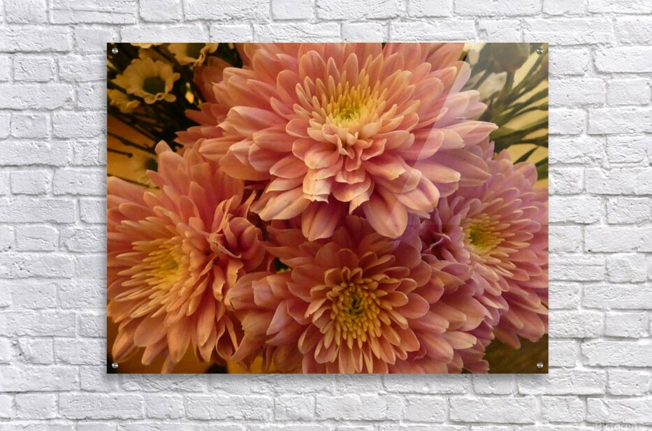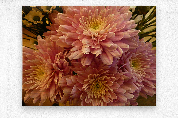 Originally a close up photo of flowering blooms, laterally digitally manipulated into a lovely piece of modern floral art. Features pink chrysanthemums clustered together, displaying their delicate petals and vibrant yellow centers. The flowers are surrounded by a mix of greenery and smaller white blooms.