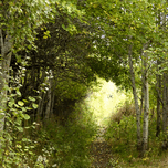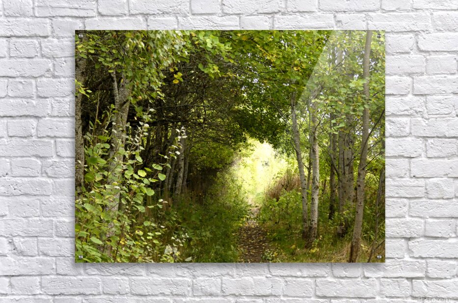 I took this photo during a lovely summer nature walk through the Scottish Highlands. Features a lush, green Birch forest path enveloped by trees and foliage, leading toward a brightly lit opening. Sunlight filters through the leaves, casting a serene and inviting glow on the trail.