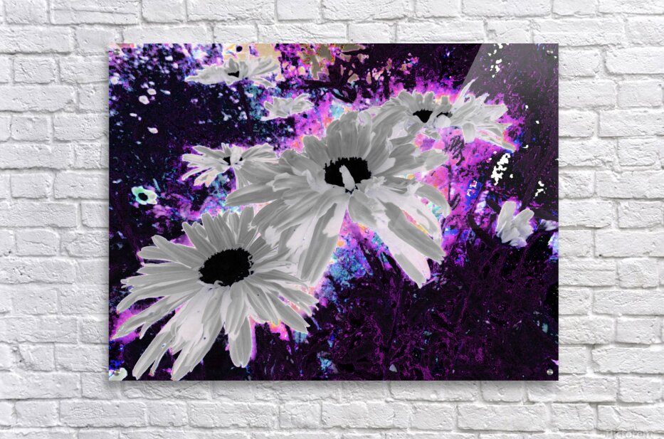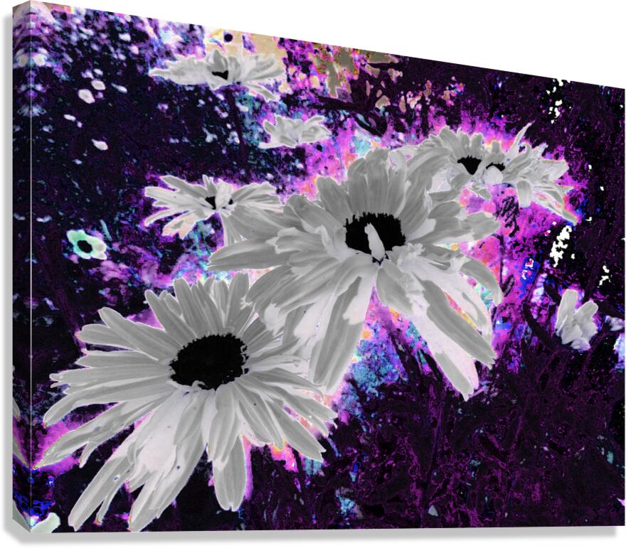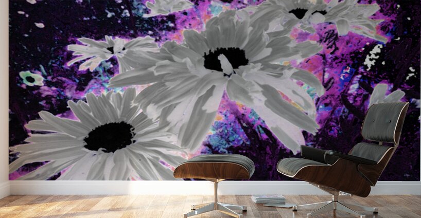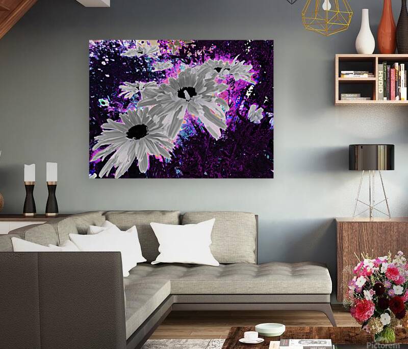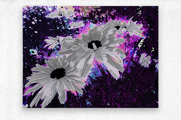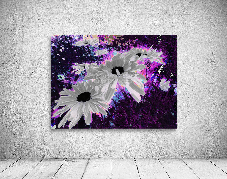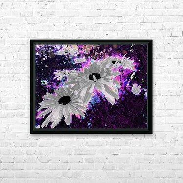 Originally a coloured photo of Daises laterally digitally manipulated to create a stunning piece of floral contemporary art. Features large daisy flowers dominating the foreground, in monochrome against a vibrant, abstract background of purples and blues. The contrast highlights the flowers' delicate petals, creating a striking visual effect.