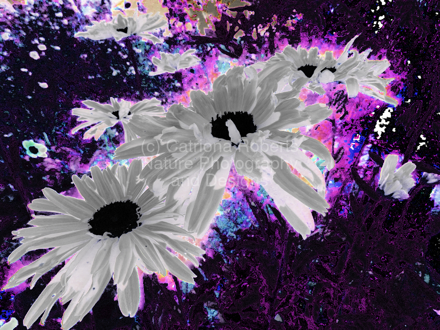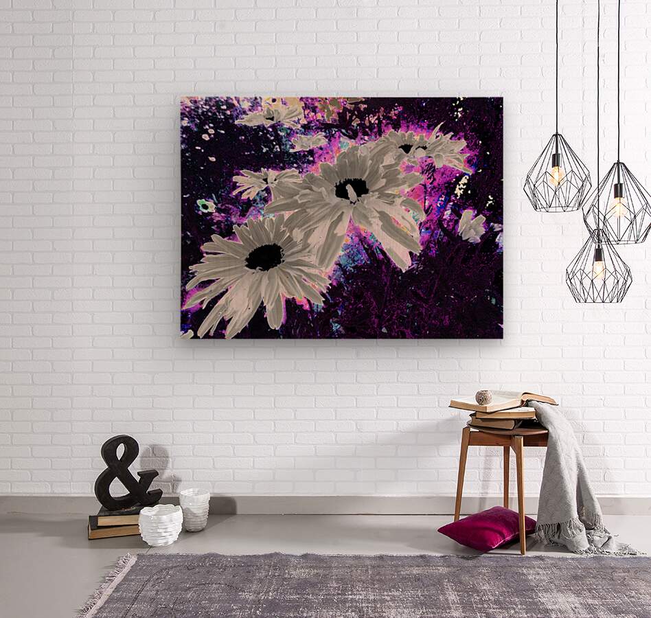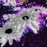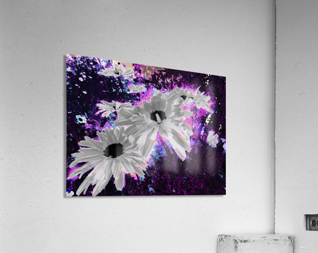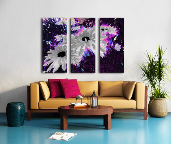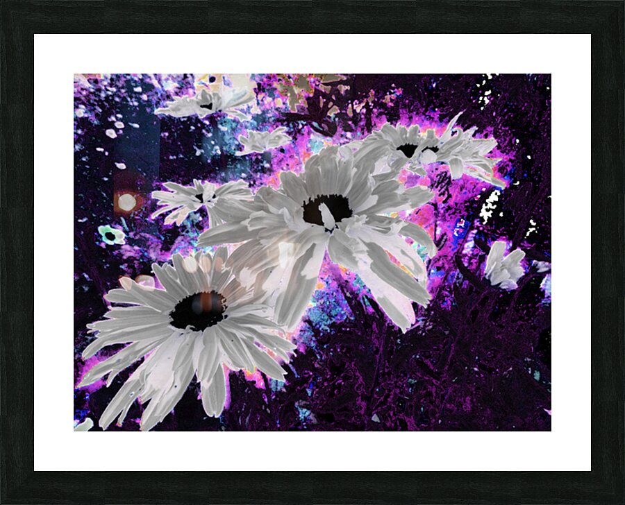 Originally a coloured photo of Daises laterally digitally manipulated to create a stunning piece of floral contemporary art. Features large daisy flowers dominating the foreground, in monochrome against a vibrant, abstract background of purples and blues. The contrast highlights the flowers' delicate petals, creating a striking visual effect.