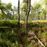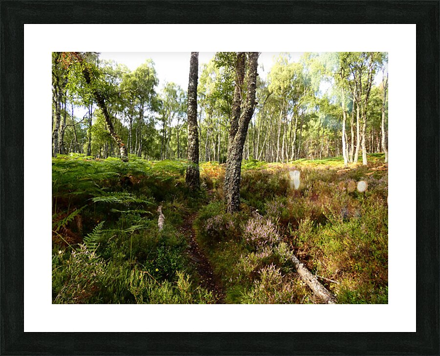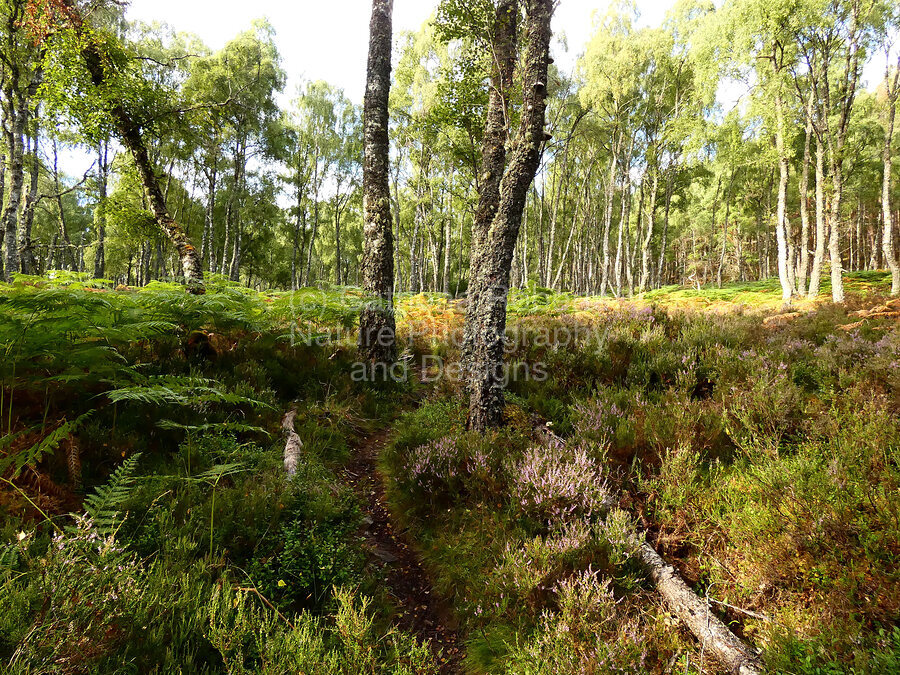 I took this photo during a lovely summer nature walk through the Scottish Highlands. Features sunlight filtering through a lush forest, highlighting a narrow dirt path winding through tall Pine trees and dense undergrowth. Vibrant green ferns and patches of purple heather add color and contrast to the serene woodland scene. Lovely Birch trees stand proudly in the background.