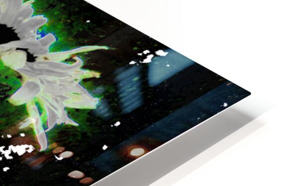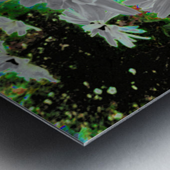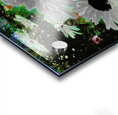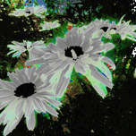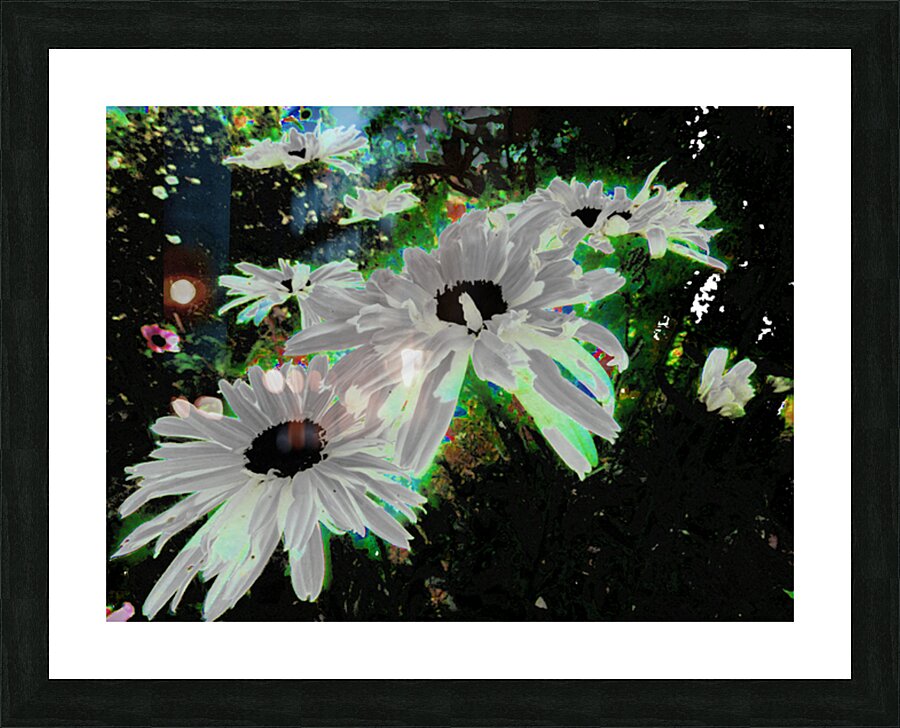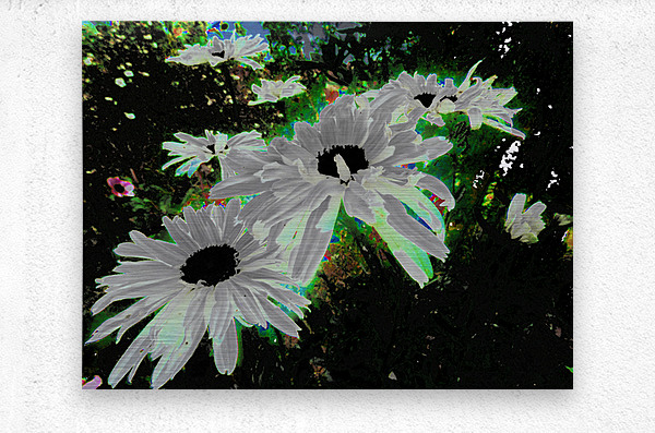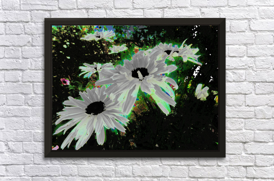 Originally a coloured photo laterally digitally manipulated to create a stunning piece of contemporary floral art. Features a cluster of Daisies with an inverted color effect, featuring bright whites, and deep blacks against a kaleidoscopic background. The scene gives a psychedelic feel, with vivid colors and a surreal ambiance.