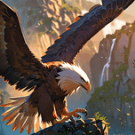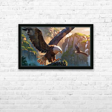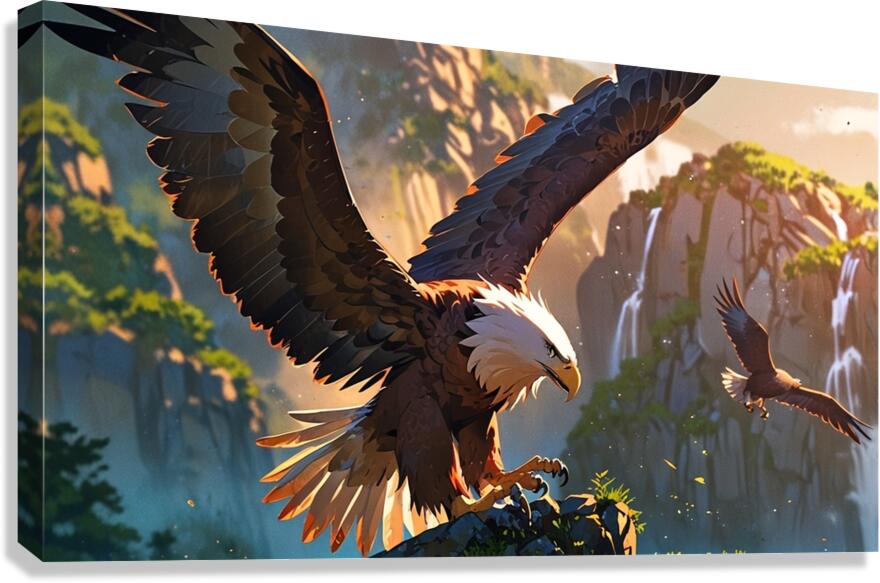 Soaring high above a breathtaking canyon, the majestic bald eagle commands the skies with fearless grace and power. Set against cascading waterfalls a...[+]