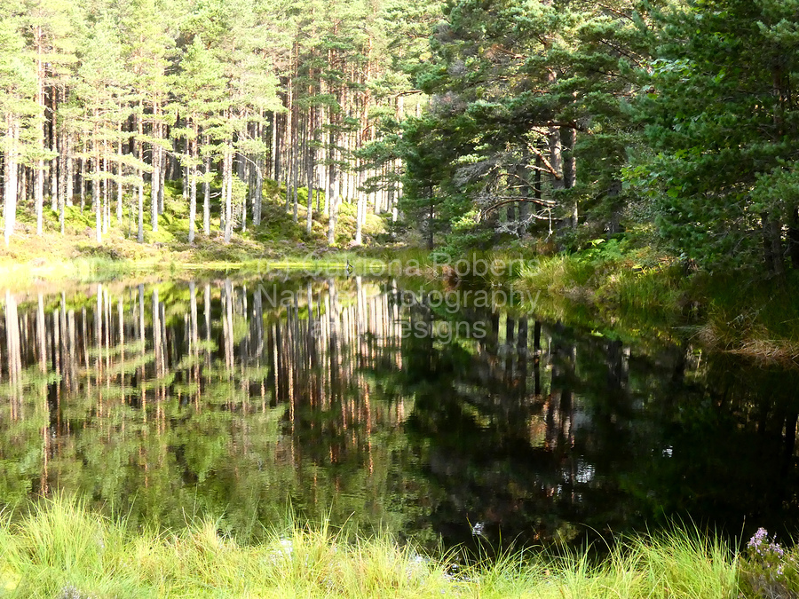I took this photo during a lovely summer nature walk through the Scottish Highlands. Features a serene Pine forest showcasing a lochan with clear reflections of tall Pine trees lining its banks, creating a mirror-like effect. Lush greenery surrounds the water, enhancing the tranquil and pristine atmosphere of the landscape.