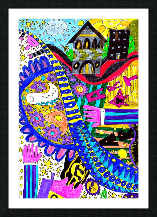 A hand drawn doodle inspired design created using coloured ink pens and paper. A vibrant scene filled with whimsical elements features a colorful house and abstract patterns. Stars, clouds, and playful hands contribute to a sense of lively movement and creativity. Bright colors and imaginative designs dominate the composition.