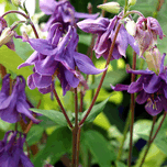 I took this photo during a lovely spring day. Features purple Columbine flowers with delicate petals in full bloom, surrounded by lush green foliage. ...[+]